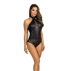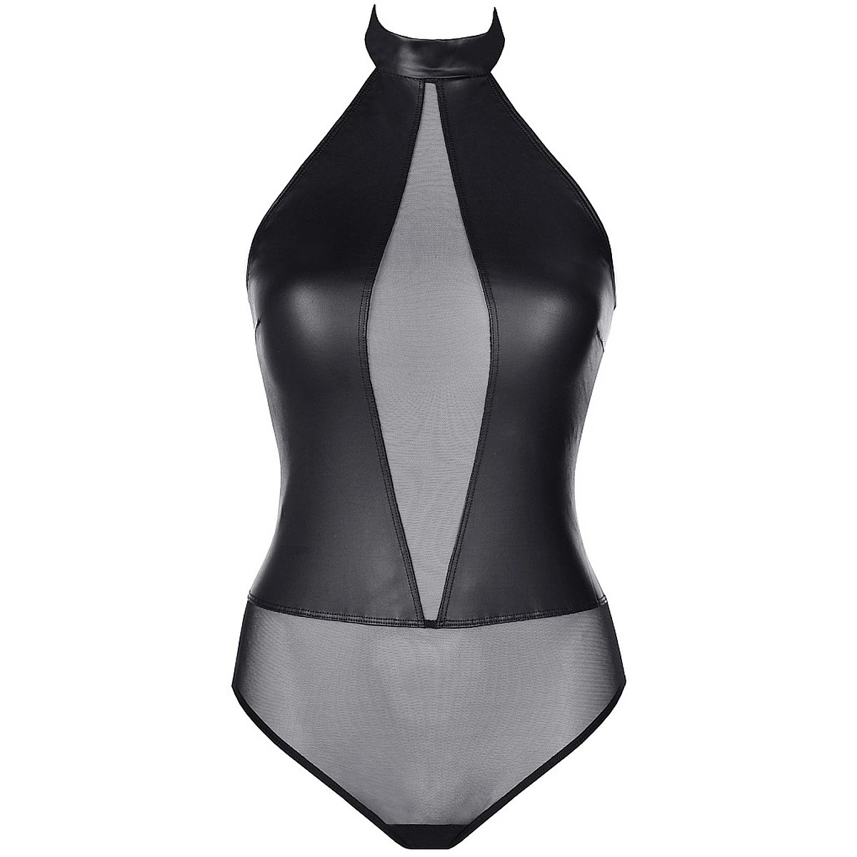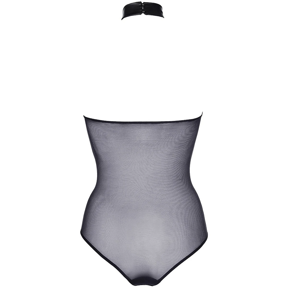 Dieser stylishe Neckholder-Body besticht durch einen verführerischen Mix aus mattem Wetlook-Material und halbtransparentem Tüll-Gewebe. Der Neckholder liegt eng am Hals an und wird durch zwei Knebelknöpfe am Nacken geschlossen. Das latexähnliche Polyester-Gewebe wird gekonnt zu den Brüsten geführt, während das Dekolleté von einem Schlitz in halbtransparentem Tüll-Gewebe aufwändig in Szene gesetzt wird. Der Neckholder-Body ist rückenfrei gearbeitet und verfügt im Schritt über einen Häkchenverschluss zum leichteren An- und Ausziehen.