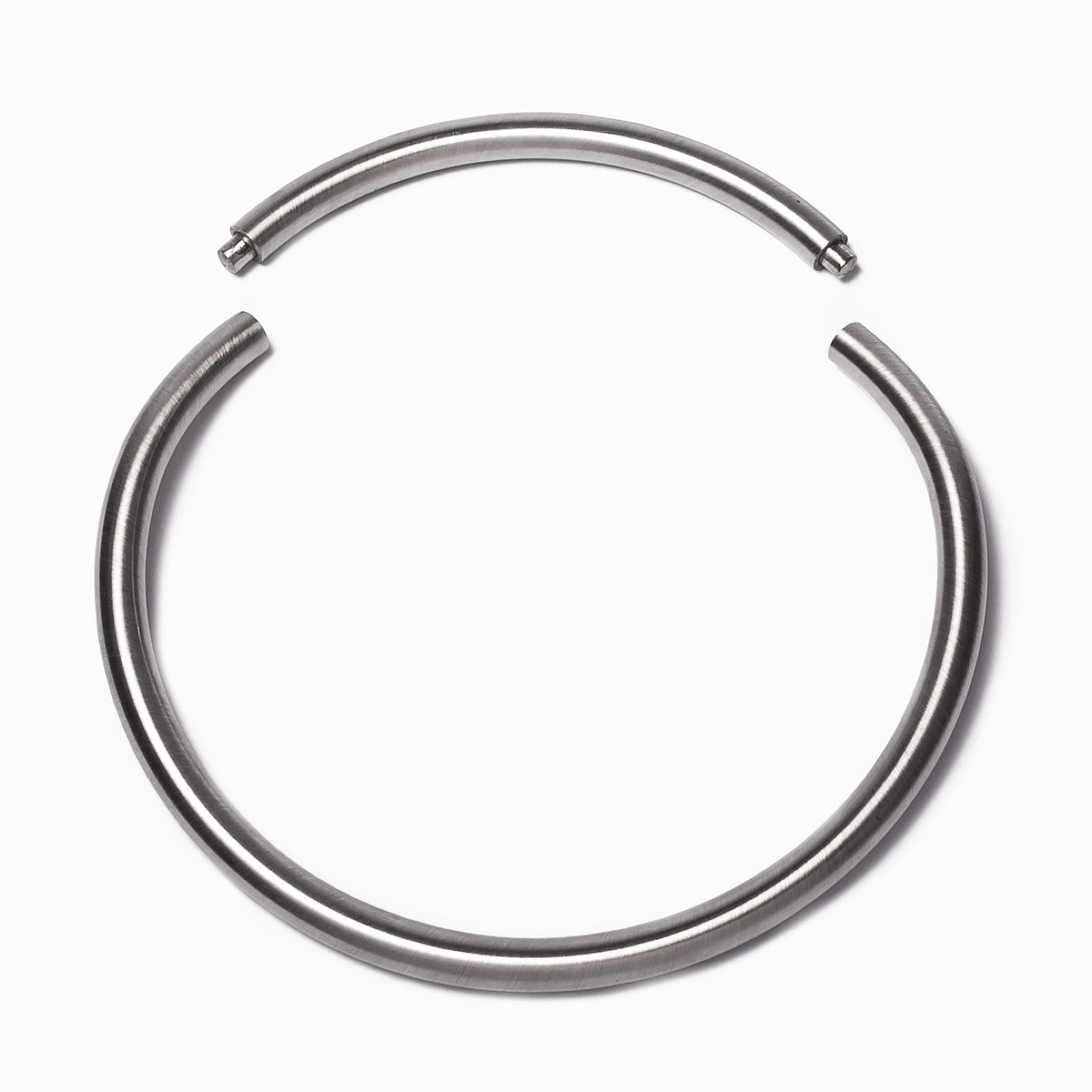 Der Reif besteht aus dem vorderen Hauptteil und einem herausziehbaren Segment im Nacken, welches – durch Pass-Stifte zentriert – von der Federkraft des größeren Haupt-Teiles gehalten wird. Zum Öffnen und Schließen ist also etwas Kraft erforderlich.