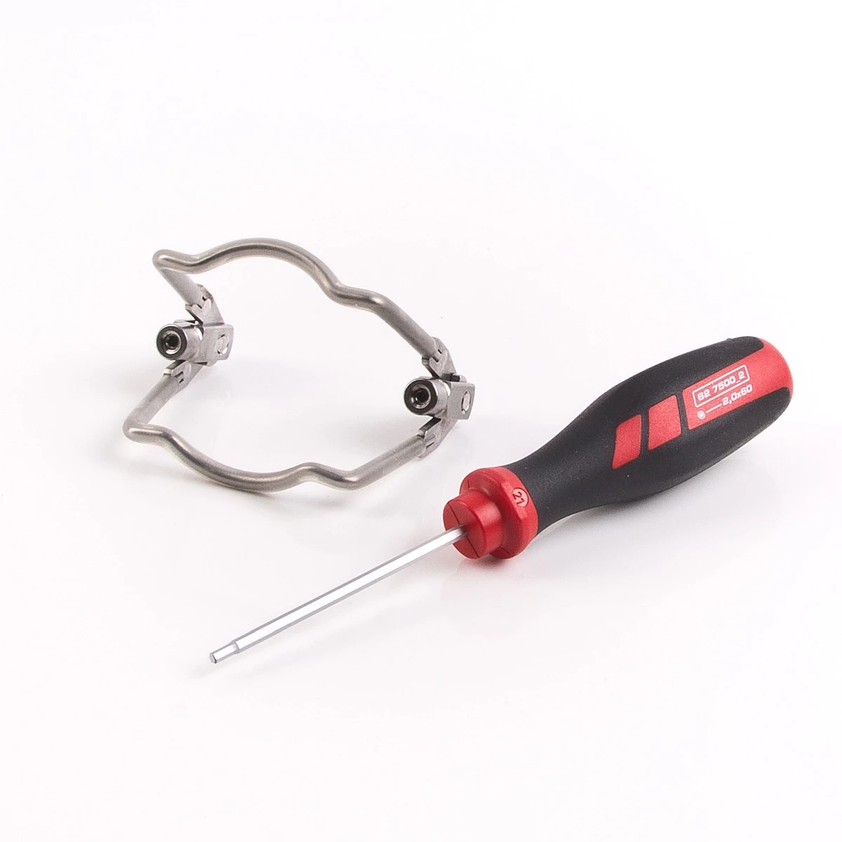 Der trägerlose Mundspreizer besteht vollständig aus rostfreiem, nickelfreiem Edelstahl und wird (am besten in der am wenigsten geöffneten Einstellung) direkt hinter den Zähnen im Mund eingesetzt. Nun lassen sich die beiden Einstellschrauben mit dem mitgelieferten Verstellwerkzeug drehen, was die Öffnungsweite des Kieferspreizers erhöht. Ein Schließen des Mundes ist nun wie bei einem Ringknebel ebenso nicht mehr möglich wie das selbstständige Entnehmen des Mundspreizers erst recht nicht ohne Zuhilfenahme der Hände.