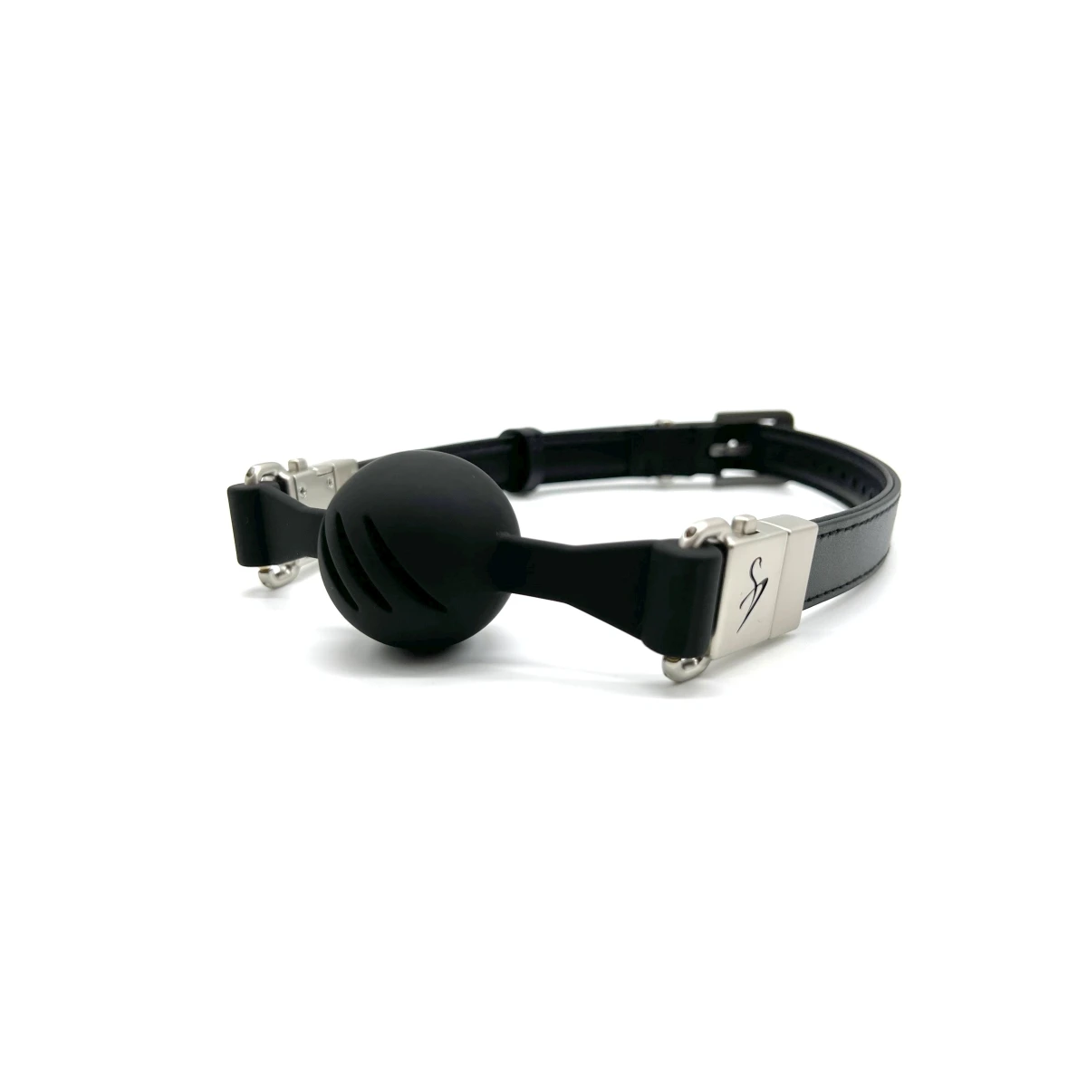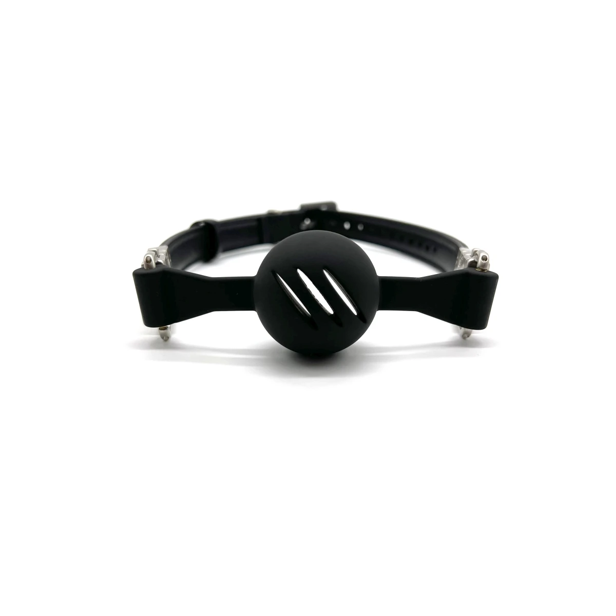 Der Knebelball aus schwarzem, 100% medizinischem Silikon sorgt für einen herrlich ausgefüllten Mundraum. Er ist in zwei unterschiedlichen Durchmessern erhältlich: 40 mm für Anfänger und Subbies mit kleinem Mund oder 45 mm für fortgeschrittenere, die gerne den Mund etwas voller haben. Der Knebelball ist dabei sehr fest und gibt kaum nach. Für ausreichend Atemluft sorgen drei durchgängige Lüftungsschlitze, die auch bei anstrengenden Sessions oder vor Erregung nach Luft schnappenden Subbies für genügend Atemluft sorgen.