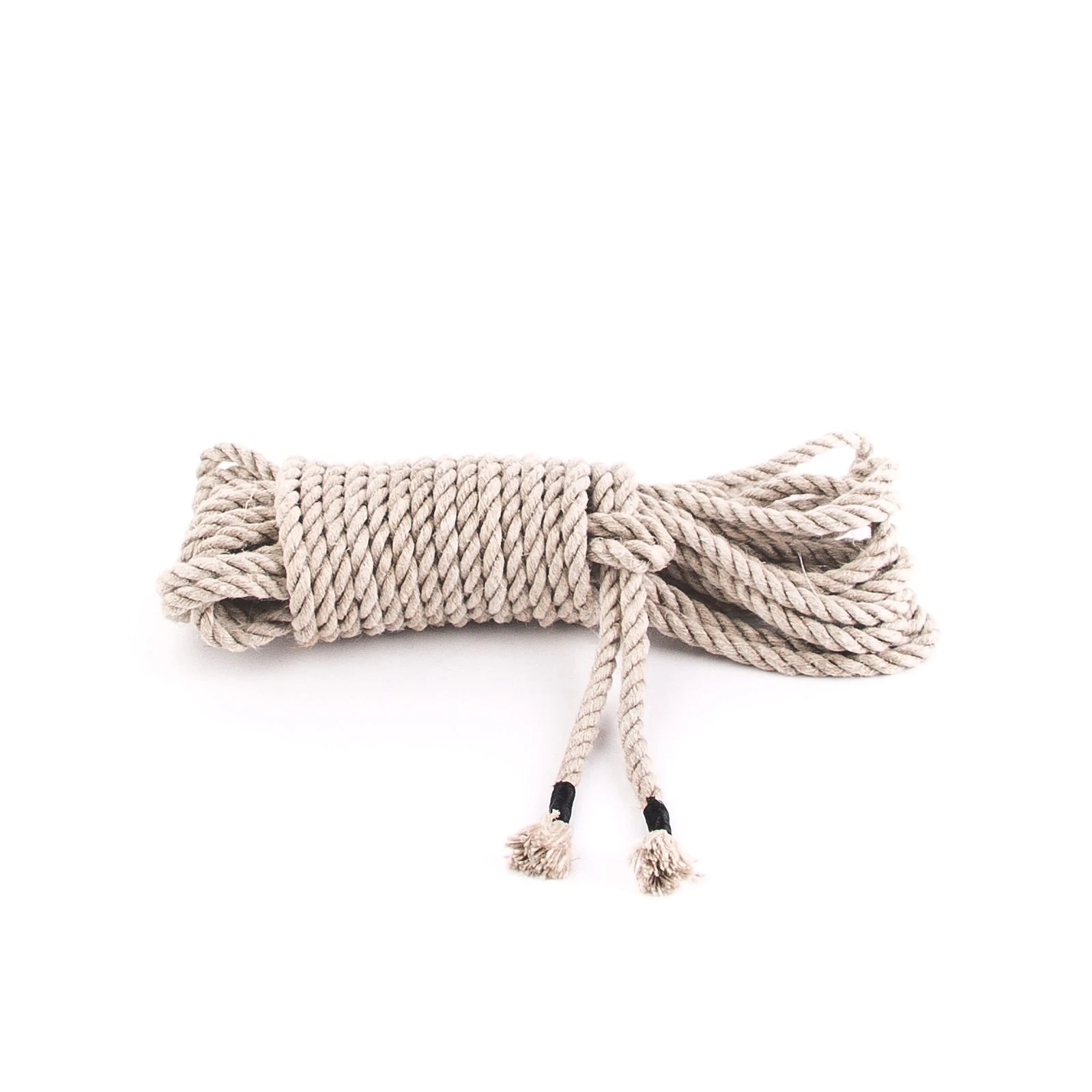 Unser fertig bearbeitetes Bondageseil aus Leinenhanf mit getakelten Enden. Die Seilenden werden in unserer eigenen Konfektion in reiner Handarbeit für Dich liebevoll mit speziellem Takelgarn veredelt.
