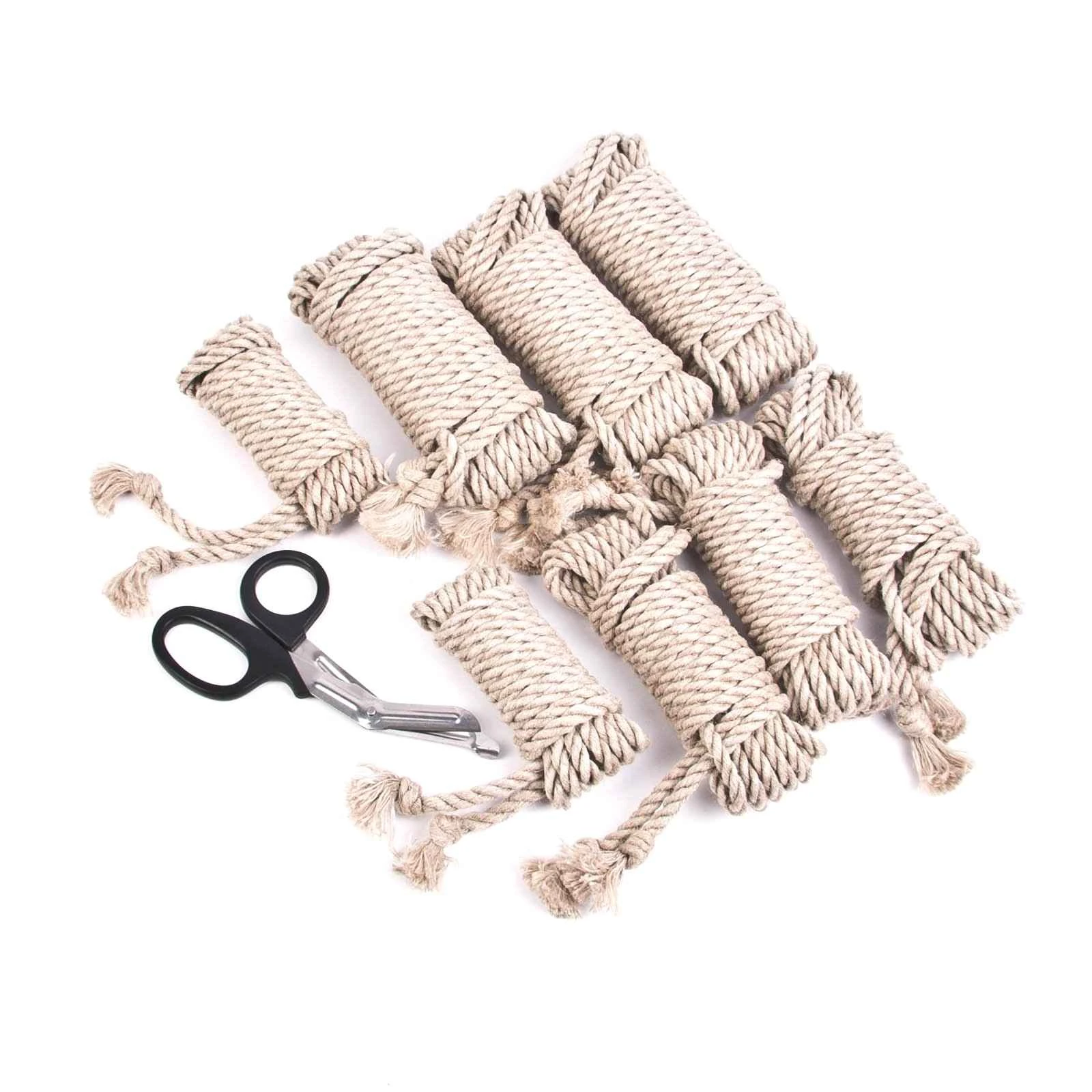 Atemberaubendes Seilset in klassischer fesselfertiger Bearbeitung mit 6 mm Durchmesser. Wir haben die Zusammenstellung des Sets zusammen mit und für den JOYclub und in Zusammenarbeit mit Ater Crudus entwickelt. Das Material besteht aus einer Mischung aus Hanf und Leinen. Es ist vorgewaschen, unter Zug getrocknet und fesselfertig veredelt. Eine Schere für Notfälle ist im Set enthalten.