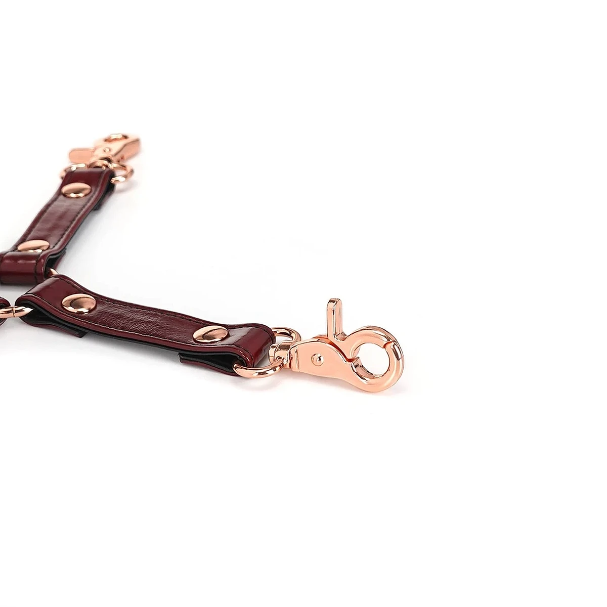 Der edle LiebeSeele®-Hogtie-Connector aus weinrotem Rindsleder mit roségoldenen Metallteilen strahlt eine exklusive Prise Luxus aus und sorgt beim BDSM-Spiel für das gewisse Flair. Liebevoll und sorgfältig in Handarbeit gefertigt und aus hochwertigsten Materialien bestehend ist dieser Connector nicht nur optisch außergewöhnlich, auch die integrierten Klauen-Karabiner überzeugen durch solide Qualität. Die Ränder der Lederriemen sind für eine langfristige Verwendbarkeit abgerundet und präzise abgesteppt.