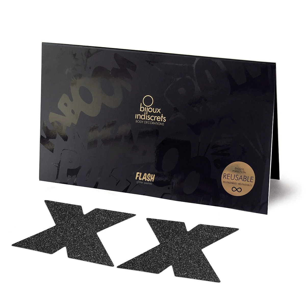 Die schwarzen Flash Cross Nipple Cover Pasties in Kreuzform funkeln sexy und glamourös durch viele kleine Glitter-Partikel auf der Oberfläche und haften selbstklebend auf jeder Brustform. Sie sind nicht nur in Kombination mit edlen Dessous oder im Burlesque ein besonderes Highlight sie bestechen auch mit offenen Cups oder an einem tiefen Ausschnitt in einem sexy Kleid durch ihre glamouröse Optik.