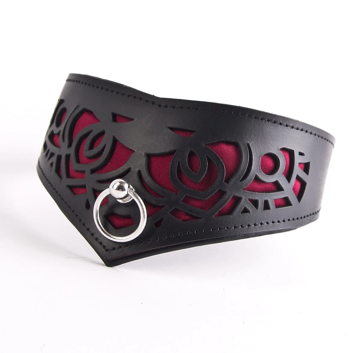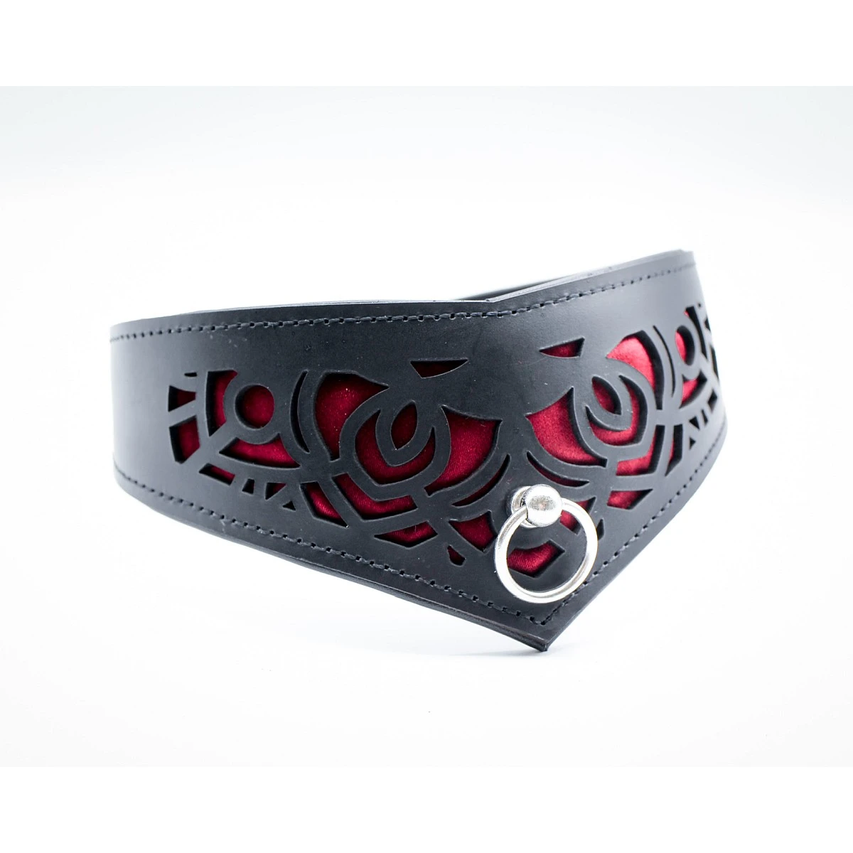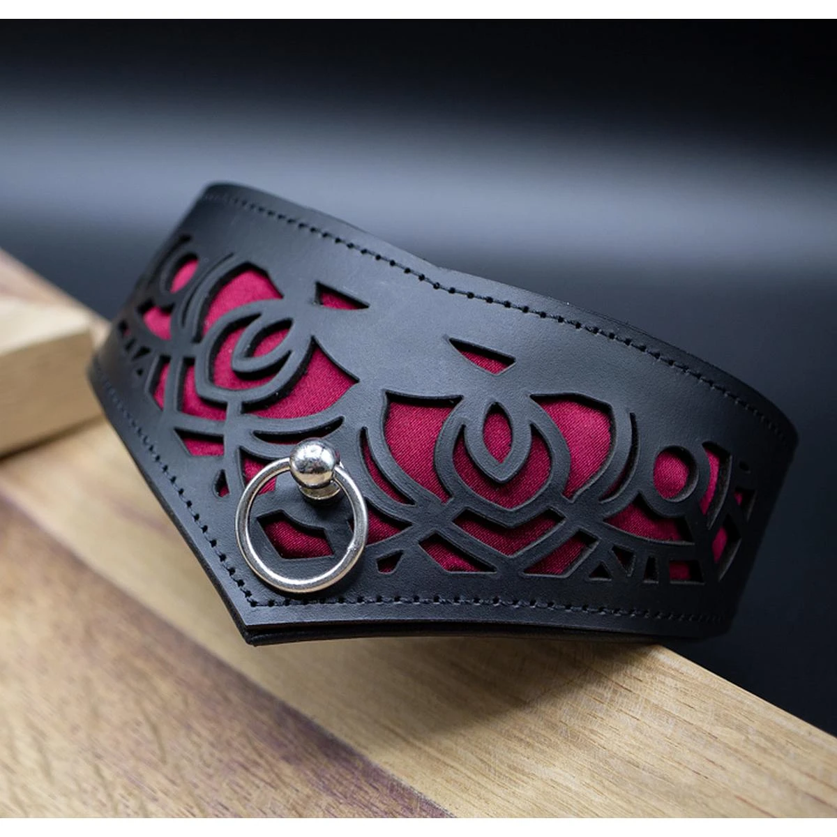 Das aufwendig in Handarbeit gefertigte breite BDSM-Halsband besteht aus einer stabilen Außenlage aus feinem, stabilem Büffelleder mit einem lasergeschnittenen Muster, das mit bordeaux-rotem Satin hinterlegt ist. Auf der Innenseite besteht das breite Halsband aus herrlich weichem, leicht gepolstertem Lammleder, was es sehr angenehm tragbar macht auch über längere Zeit, zum Beispiel über Nacht oder sogar zum Ausgehen.