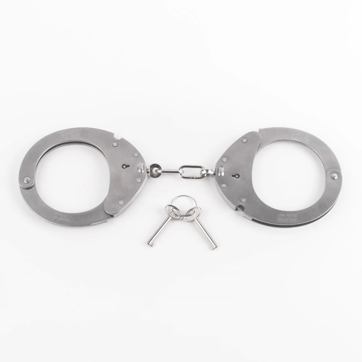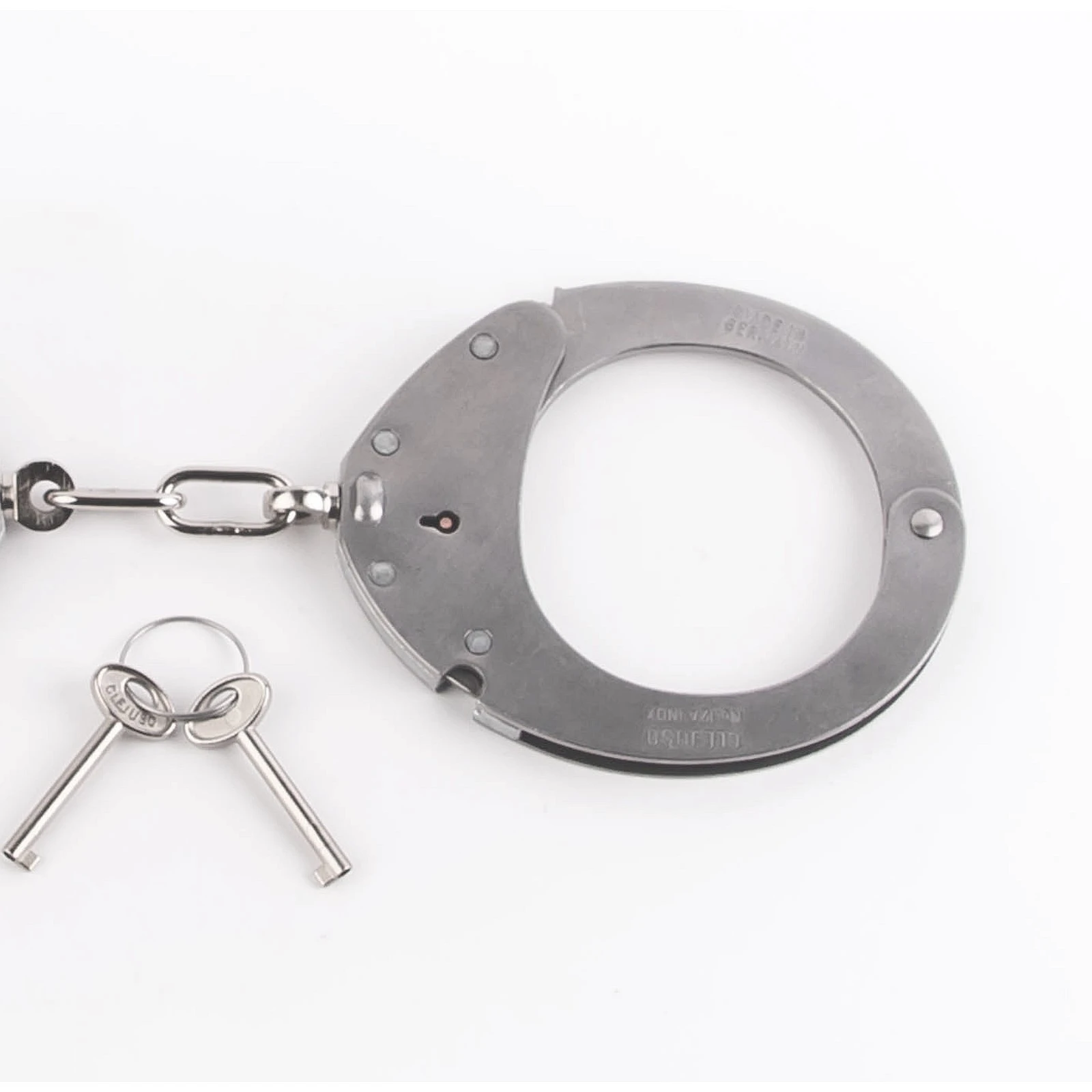 Gegen versehentliches Zudrücken werden diese Handschellen durch seitliches Eindrücken einer Arretierung gesichert. Durch Drehen des Schlüssels im Schloss löst sich zuerst die Arretierung, durch Weiterdrehen öffnet sich die Handschelle.