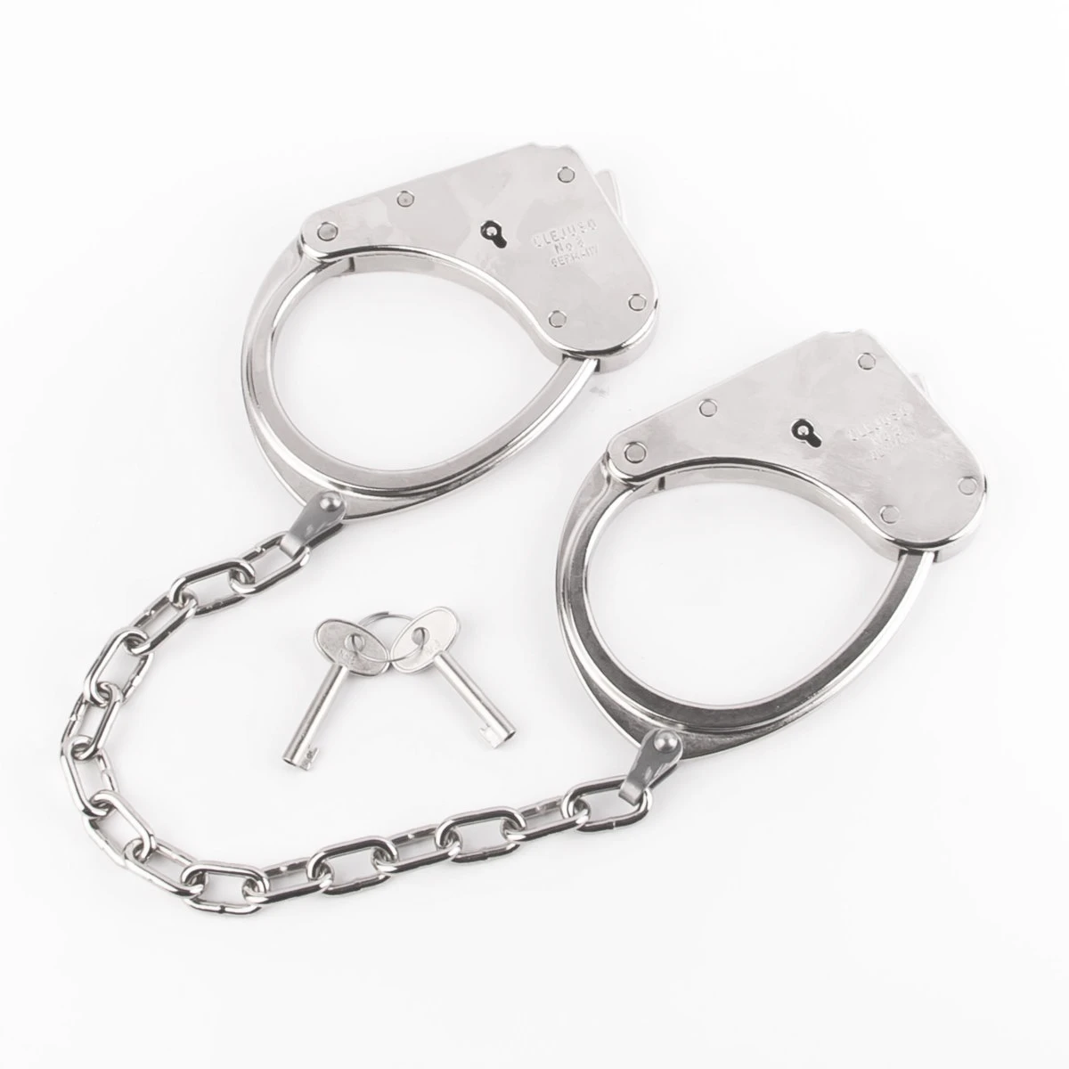 Festgestellt werden diese Fußschellen durch seitliches Eindrücken einer Arretierung. Durch Drehen des Schlüssels im Schloss löst sich zuerst die Arretierung, durch Weiterdrehen öffnet sich die Handschelle.