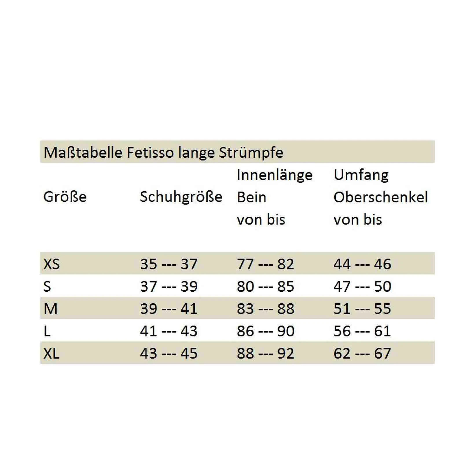 Die langen Strümpfe von Fetisso lassen sich durch das glatte Finish spielend leicht anziehen. Sie liegen eng an. Die Strümpfe sind in 5 verschiedenen Größen bestellbar, damit sie bei jeder Konfektionsgröße perfekt sitzen. So kannst Du von Kopf bis Fuß das erregende Gefühl von Latex genießen.