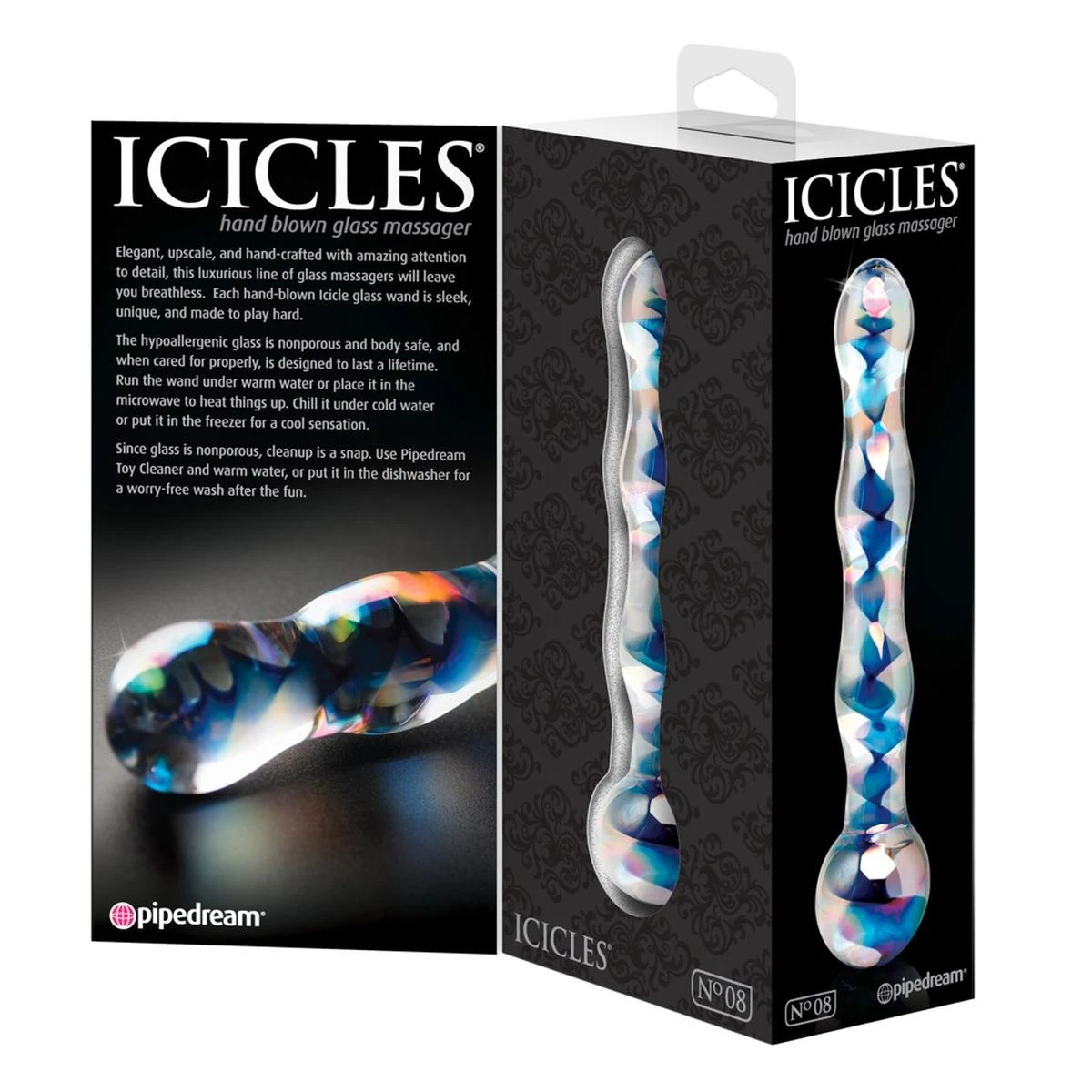 Der Glasdildo »Icicles No. 8« ist ein gerade geformter Massagestab, der auf einer Seite eine runde Kugel hat und dann schlanker und wellig wird. Während das dünnere Ende mit einem Durchmesser von ca. 2,5 cm ein leichtes Einführen ermöglicht, sorgt die etwas dickere Kugel mit einem Durchmesser von ca. 3,5 cm am anderen Ende für ein völlig anderes Gefühl beim Einführen. Du kannst den Glasdildo nämlich beidseitig nutzen, egal ob Du den Glasdildo vaginal oder anal benutzt. Die glatte Oberfläche erleichtert das Einführen.