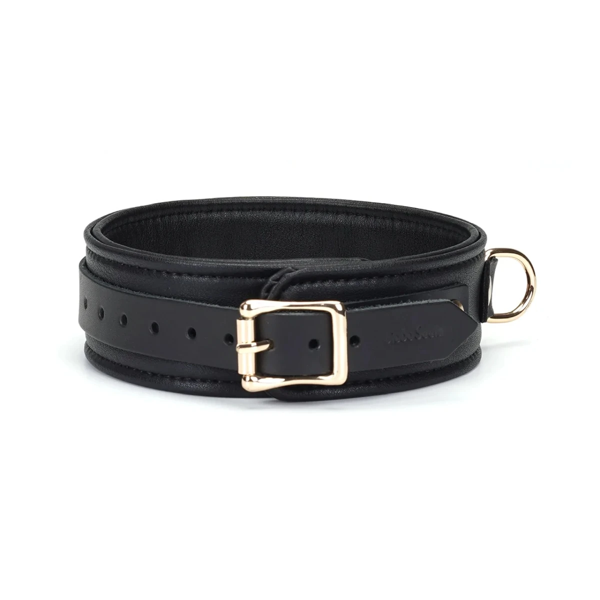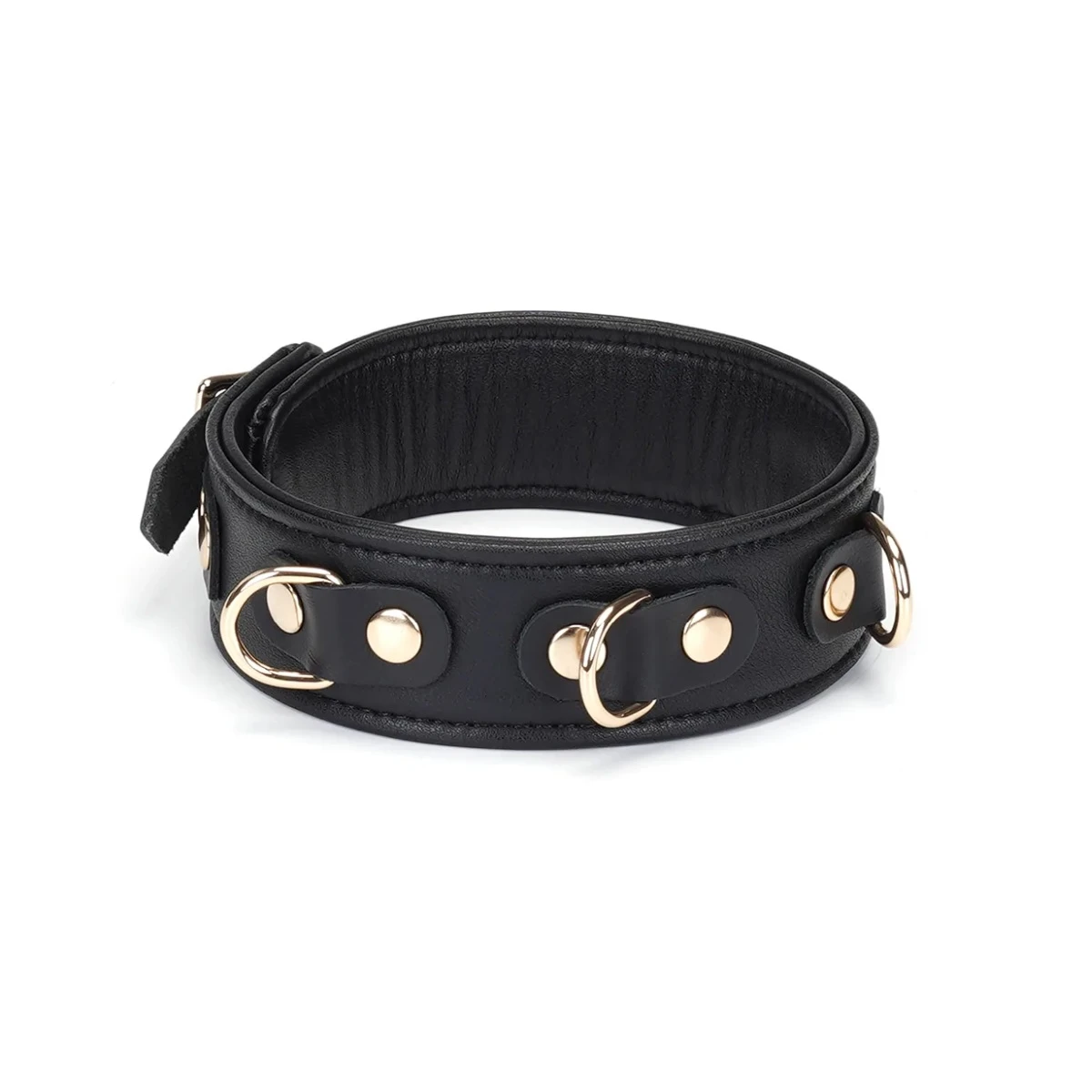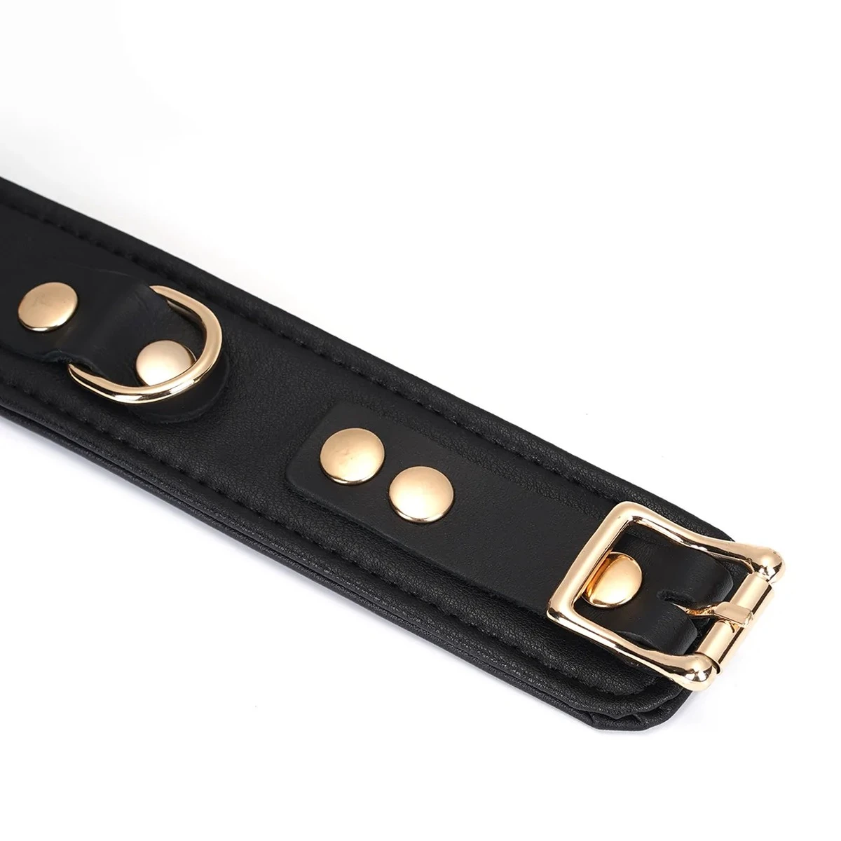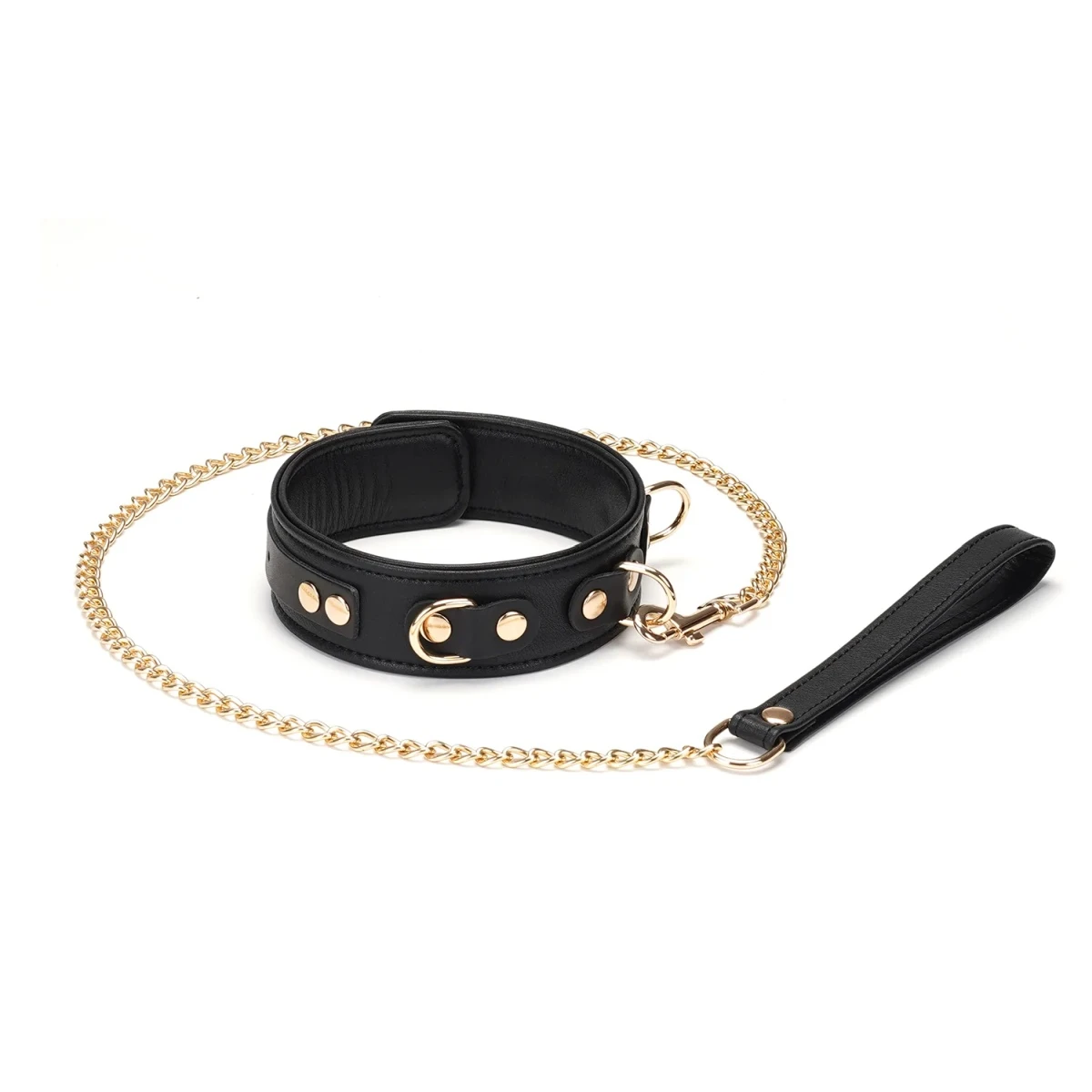 Das edle LiebeSeele® Collar-/Führleinen-Set aus schwarzem Rindsleder mit goldfarbenen Metallbeschlägen sorgt beim BDSM-Spiel für das gewisse luxuriöse Flair. Liebevoll und sorgfältig in Handarbeit gefertigt und aus hochwertigsten Materialien bestehend ist dieses Set nicht nur optisch außergewöhnlich, das Halsband trägt sich aufgrund des hochwertigen und weichen Leders auch äußerst bequem. Die Ränder des Halsbands sind für eine komfortable Tragbarkeit abgerundet und präzise abgesteppt.