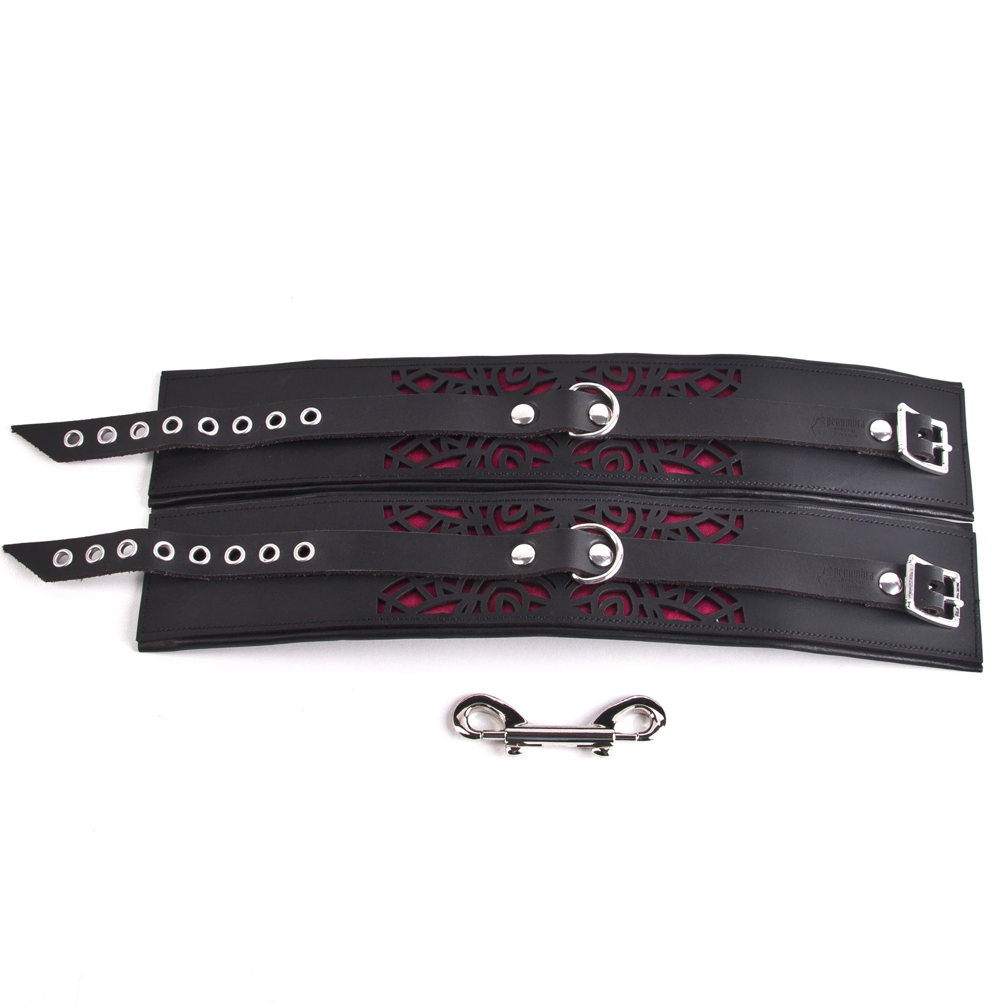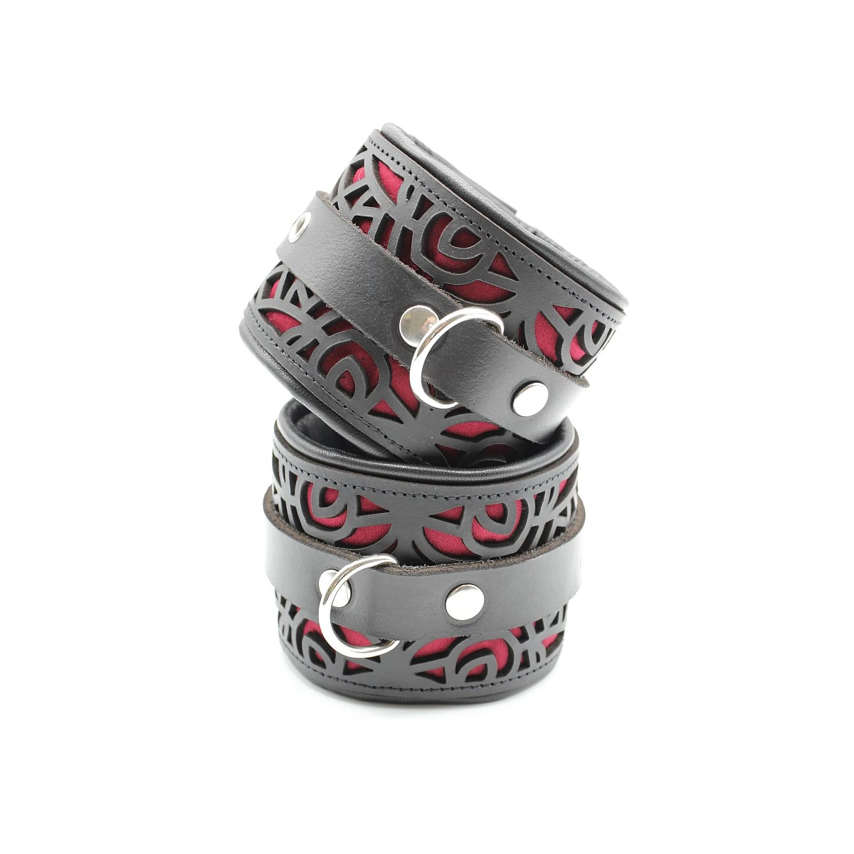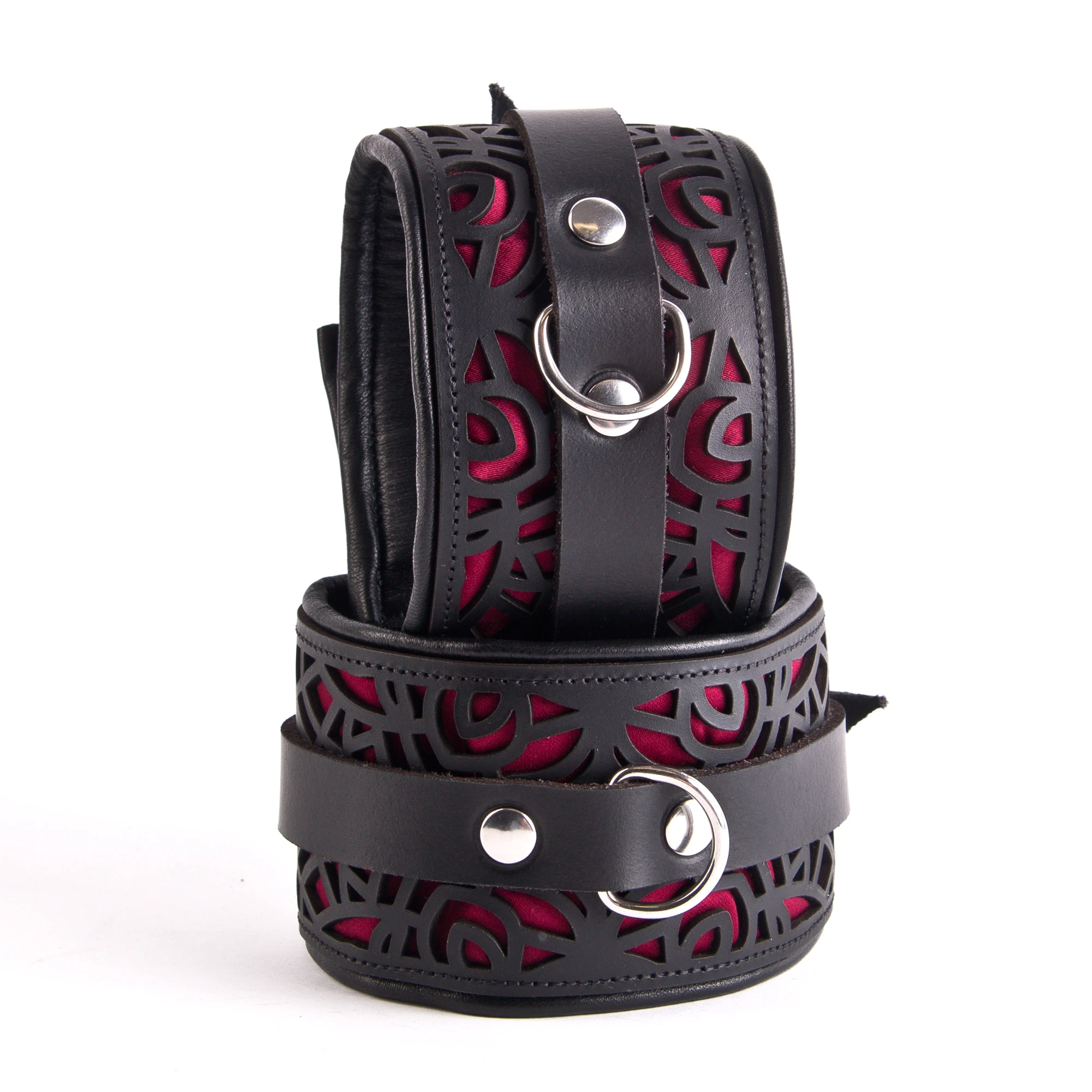 Die aufwändig in Handarbeit gefertigten Handfesseln bestehen aus einer stabilen Außenlage aus feinem, stabilem Büffelleder mit einem lasergeschnittenen Muster das mit bordeaux-rotem Satin hinterlegt ist. Auf der Innenseite bestehen die Handfesseln aus herrlich weichem, leicht gepolstertem Lammleder, was sie sehr angenehm tragbar macht auch über längere Zeit, zum Beispiel über Nacht oder sogar zum Ausgehen.