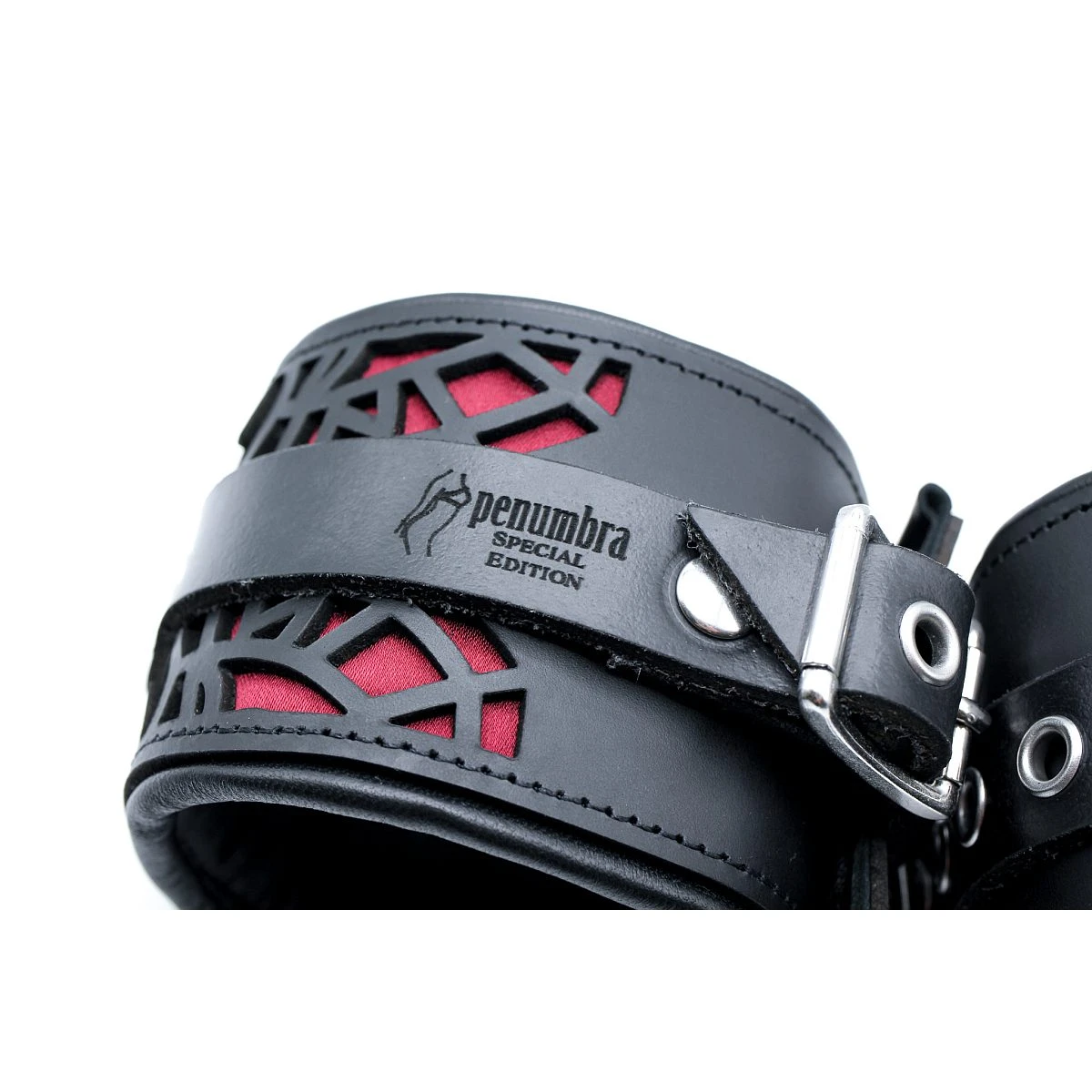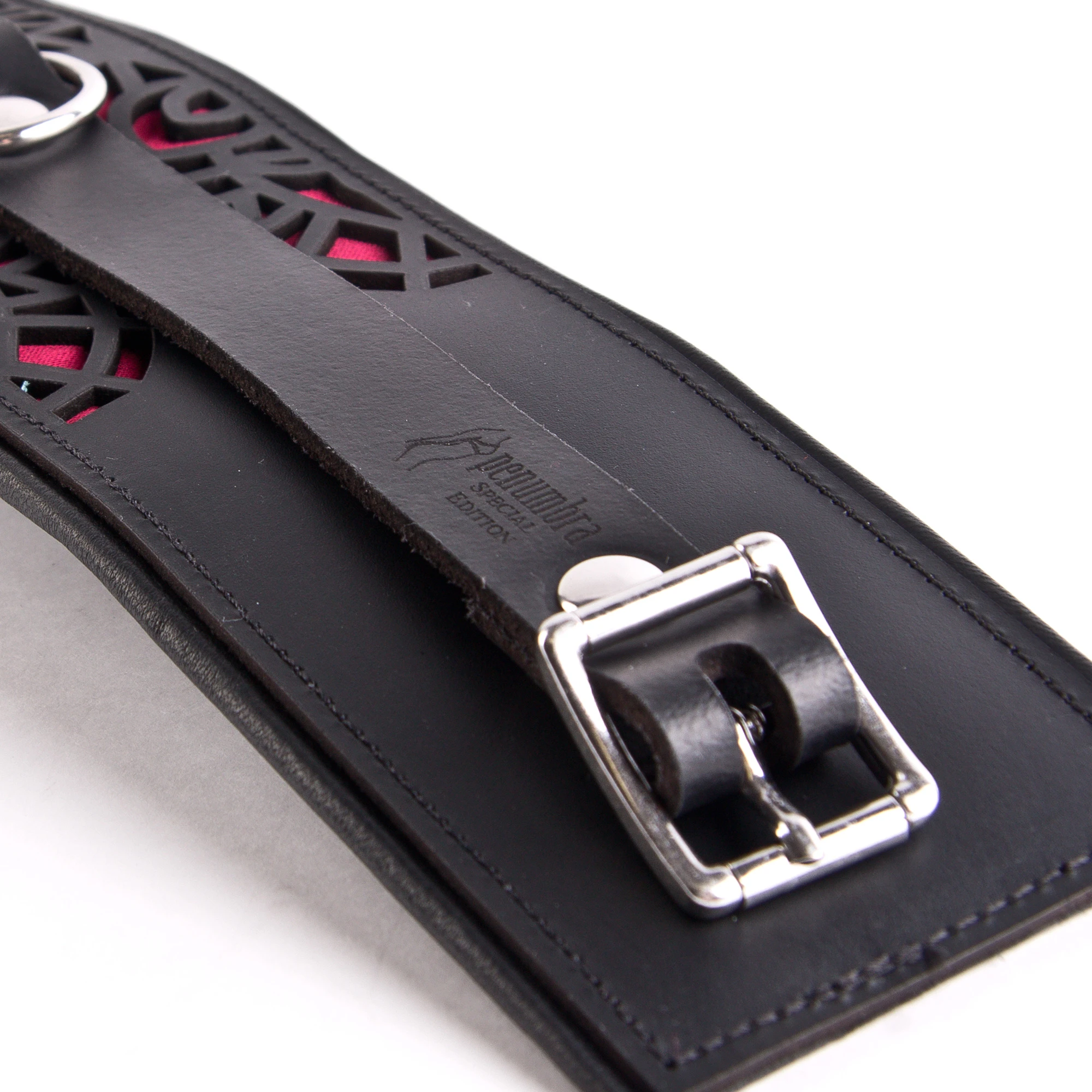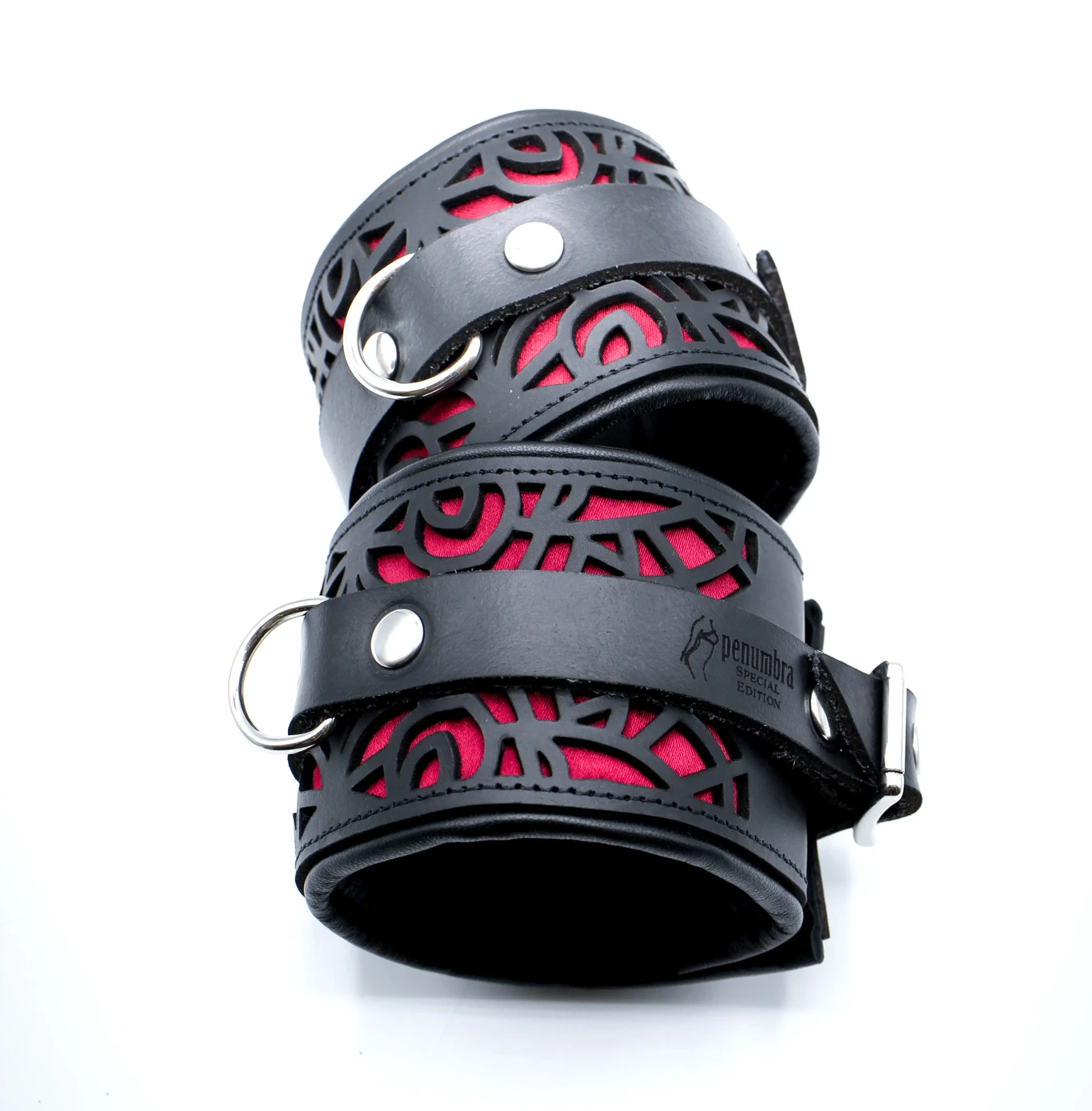 Die aufwändig in Handarbeit gefertigten Handfesseln bestehen aus einer stabilen Außenlage aus feinem, stabilem Büffelleder mit einem lasergeschnittenen Muster das mit bordeaux-rotem Satin hinterlegt ist. Auf der Innenseite bestehen die Handfesseln aus herrlich weichem, leicht gepolstertem Lammleder, was sie sehr angenehm tragbar macht auch über längere Zeit, zum Beispiel über Nacht oder sogar zum Ausgehen.