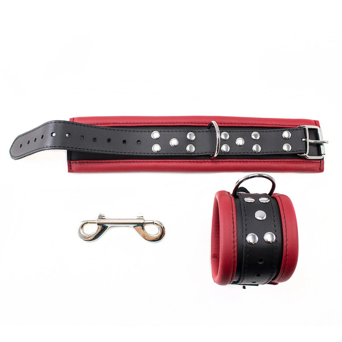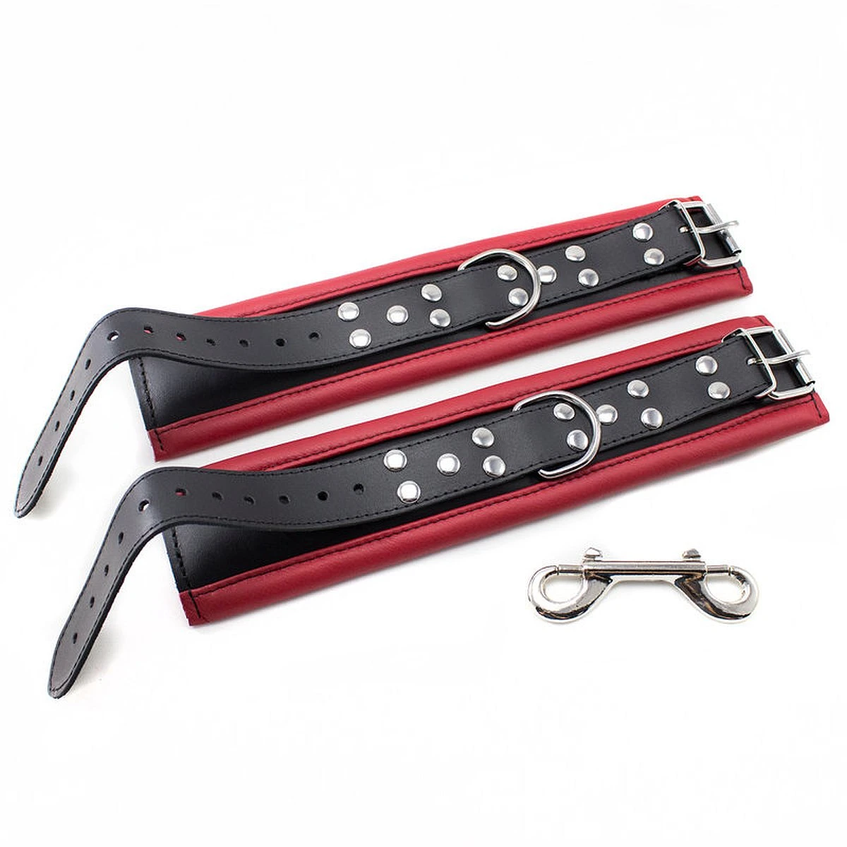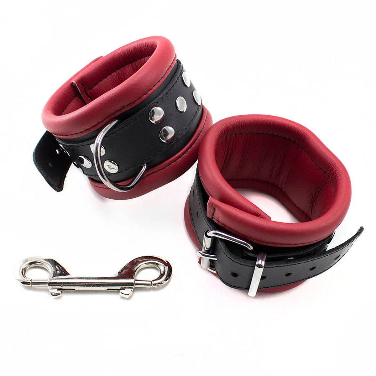 Angenehm breite Fußmanschetten aus echtem, hochwertigem Rindsleder. Sie sind größenverstellbar und mit einem geschweißten D-Ring ausgestattet. Der D-Ring ist mit nickelfreien Nieten absolut sicher befestigt. Innen sind die Fußfesseln weich gepolstert und mit glattem Nappaleder gefüttert. Innen kommen keine Metallteile mit der Haut in Berührung.