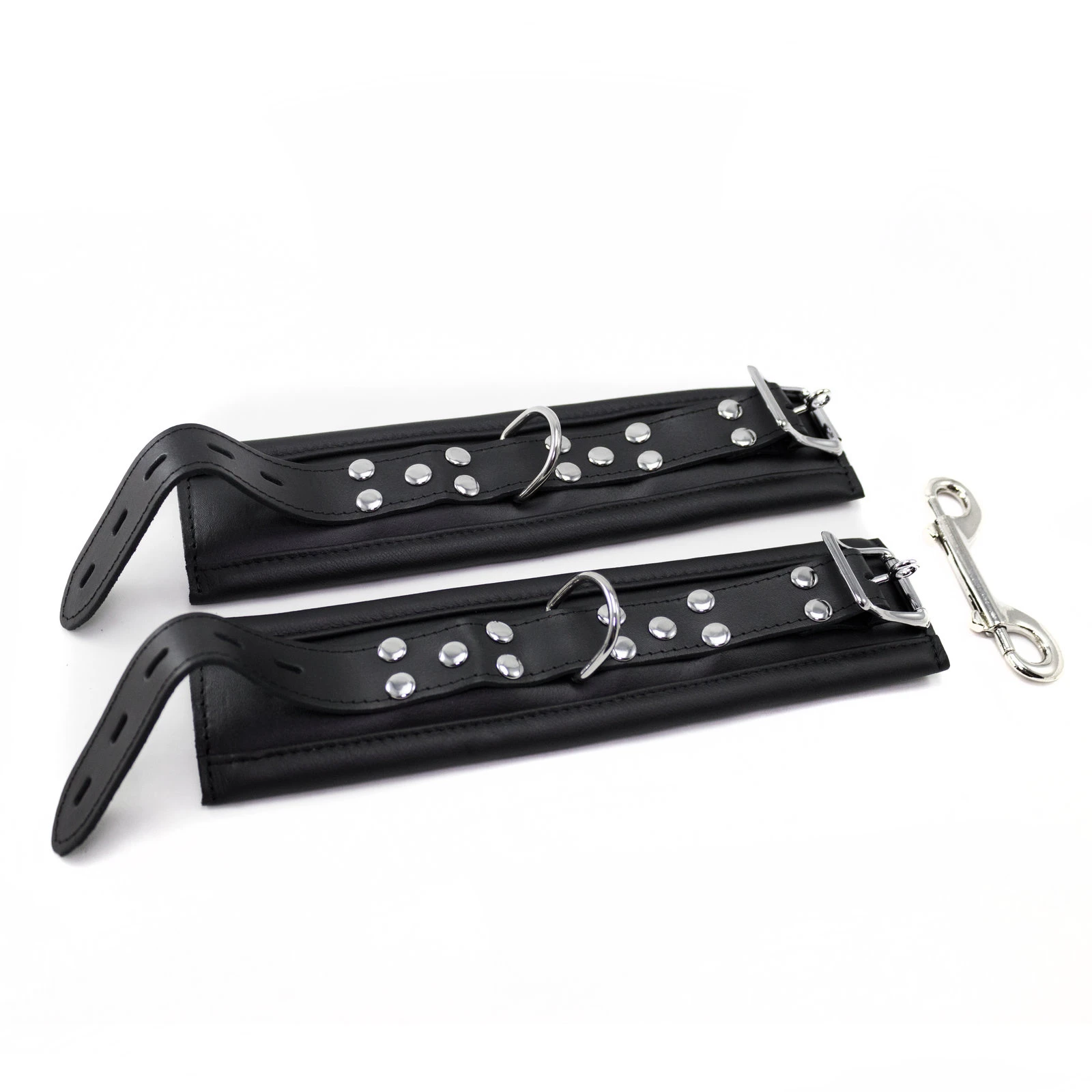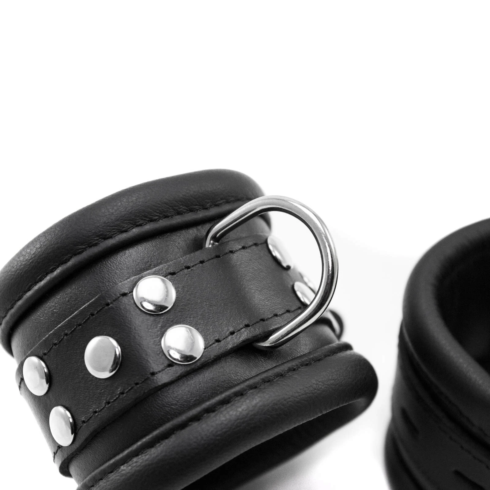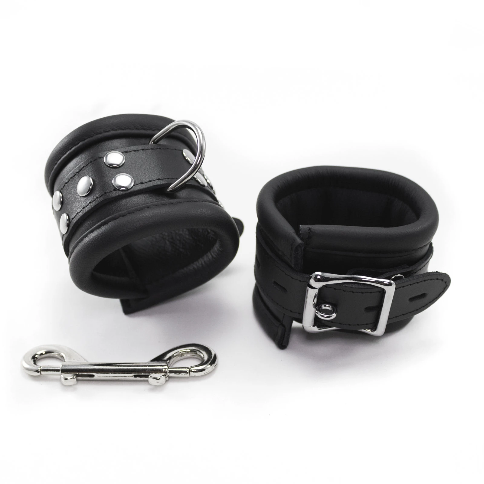 Breite Handfesseln mit abschließbarer Schnalle. Die Manschetten sind aus hochwertigem Rindsleder in Top-Qualität. Sie sind größenverstellbar und mit einer abschließbaren Rollschnalle ausgestattet. Das Lederband, an dem der D-Ring befestigt ist, wurde für guten Halt vielfach genietet. Innen sind die Handfesseln gepolstert und ebenso wie der weiche Rand mit schwarzem Glatteder verarbeitet. Das Kissen der Handmanschette ist an den schmalen Seiten glatt abgesteppt. Das bedeutet, dort wo sich die Manschette überlappt, drückt sie nicht in die Haut, sondern liegt flach an.
