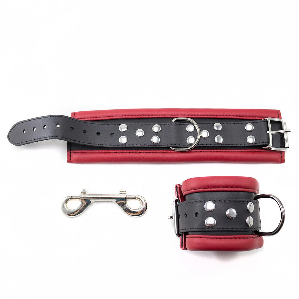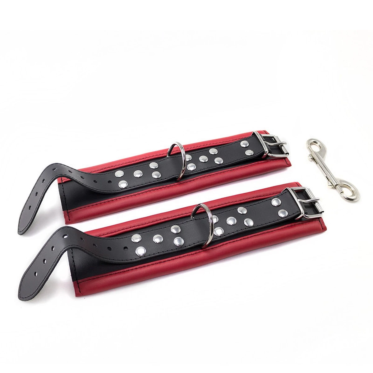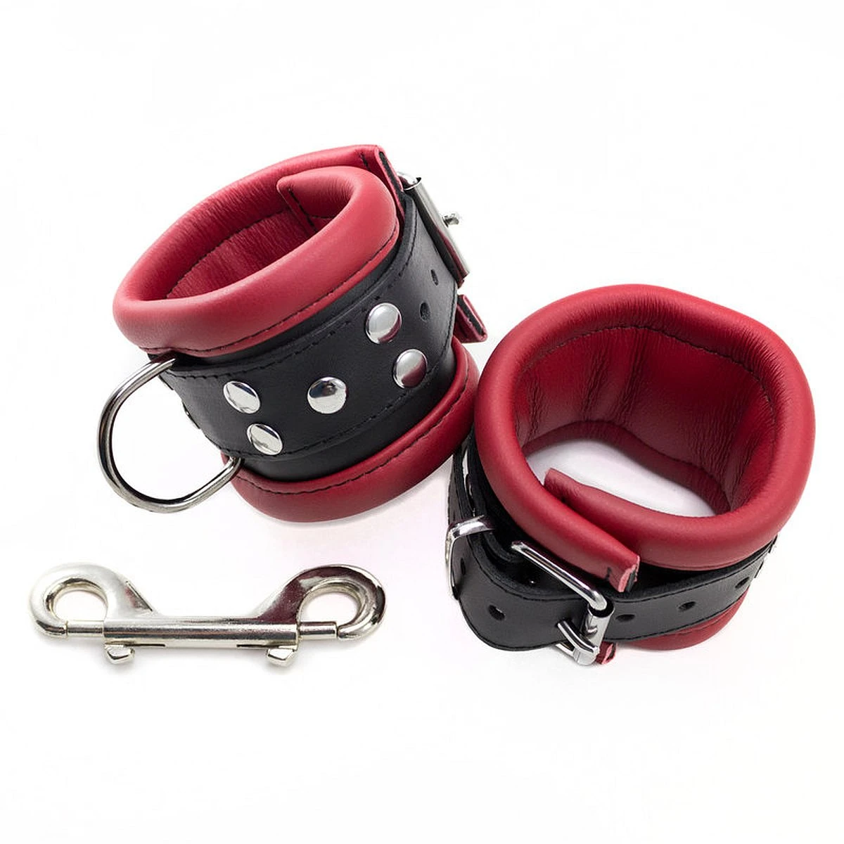 Breite Handfesseln aus hochwertigem Rindleder in Top-Qualität. Sie sind größenverstellbar. Das Lederband, an dem der D-Ring befestigt ist, wurde für guten Halt vielfach genietet. Innen sind die Handfesseln gepolstert und ebenso wie der weiche Rand mit schwarzem Glattleder verarbeitet. Das Kissen der Handmanschette ist an den schmalen Seiten glatt abgesteppt. Das heißt, dort wo sich die Manschette überlappt, drückt sie nicht in die Haut, sondern liegt flach an.