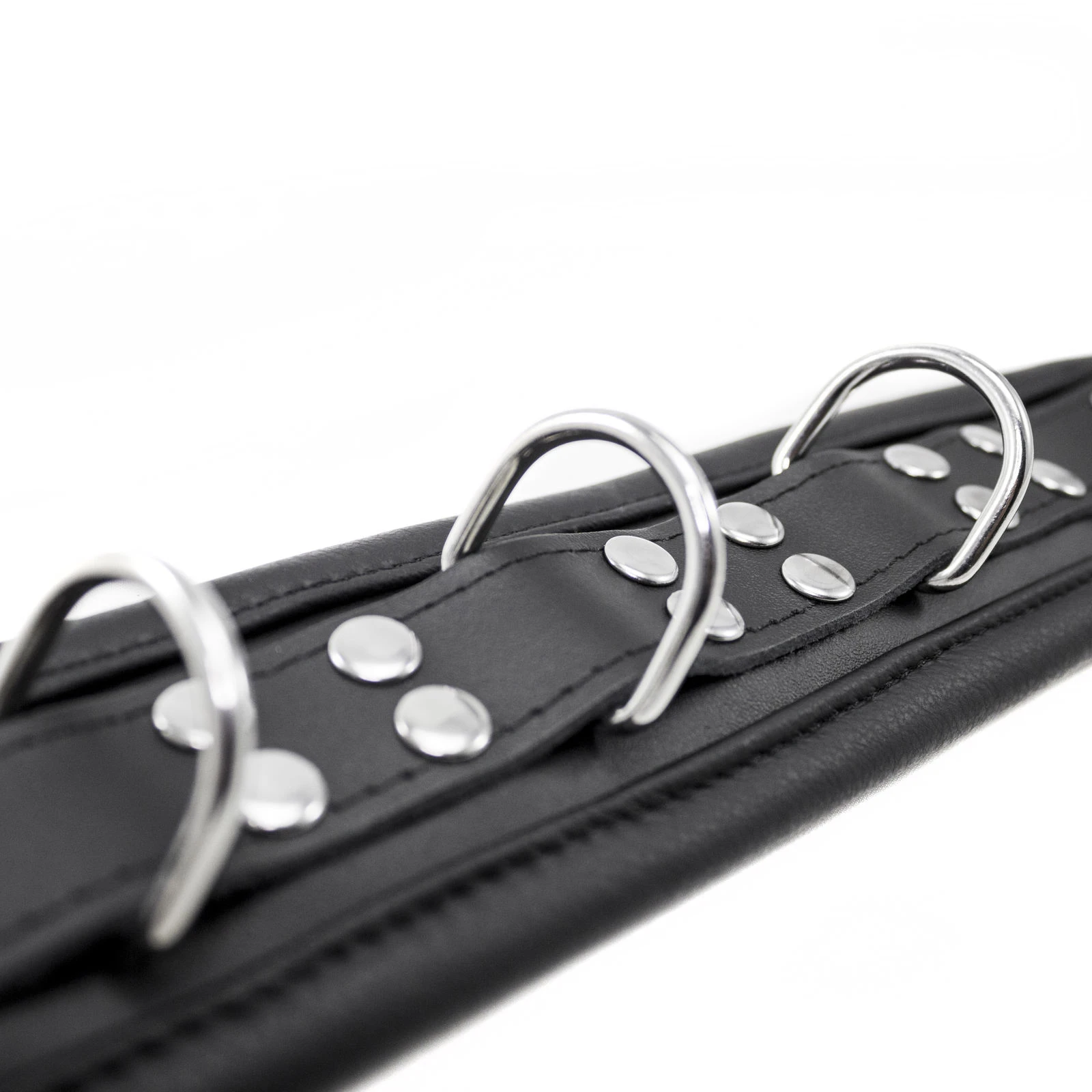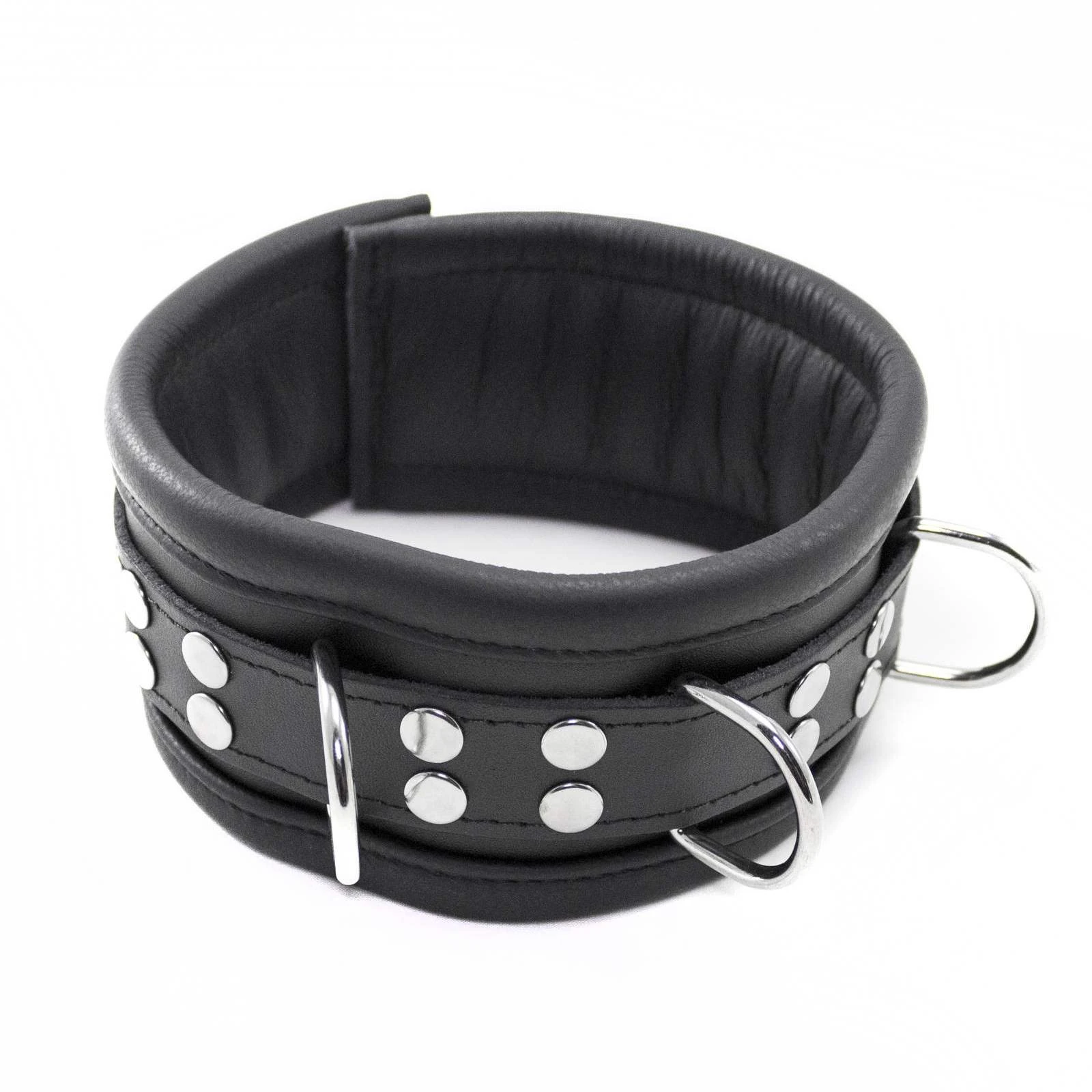 Abschließbares, breites Halsband mit 3 D-Ringen ganz in Schwarz. Diese Halsfessel ist aus hochwertigem Rindsleder, größenverstellbar und mit drei stabilen, geschweißten D-Ringen ausgestattet. Der D-Ring dient nicht nur dazu, eine Leine einzuhängen. Er ist auch gut geeignet, eine Bondage gefahrlos um den Hals zu fixieren. Seile sollte man da tunlichst vermeiden, da dies immer wieder zu Unfällen durch Strangulation führt.