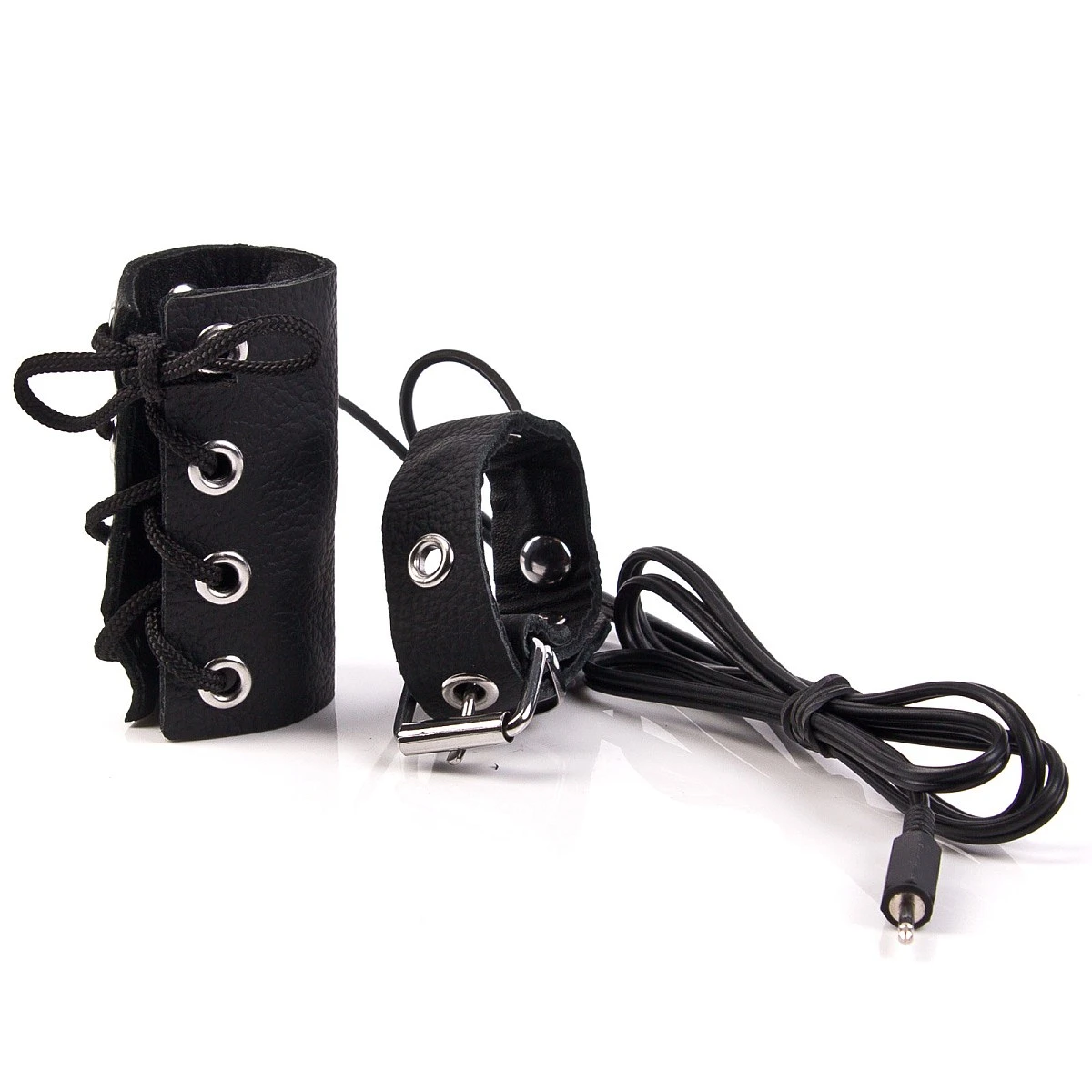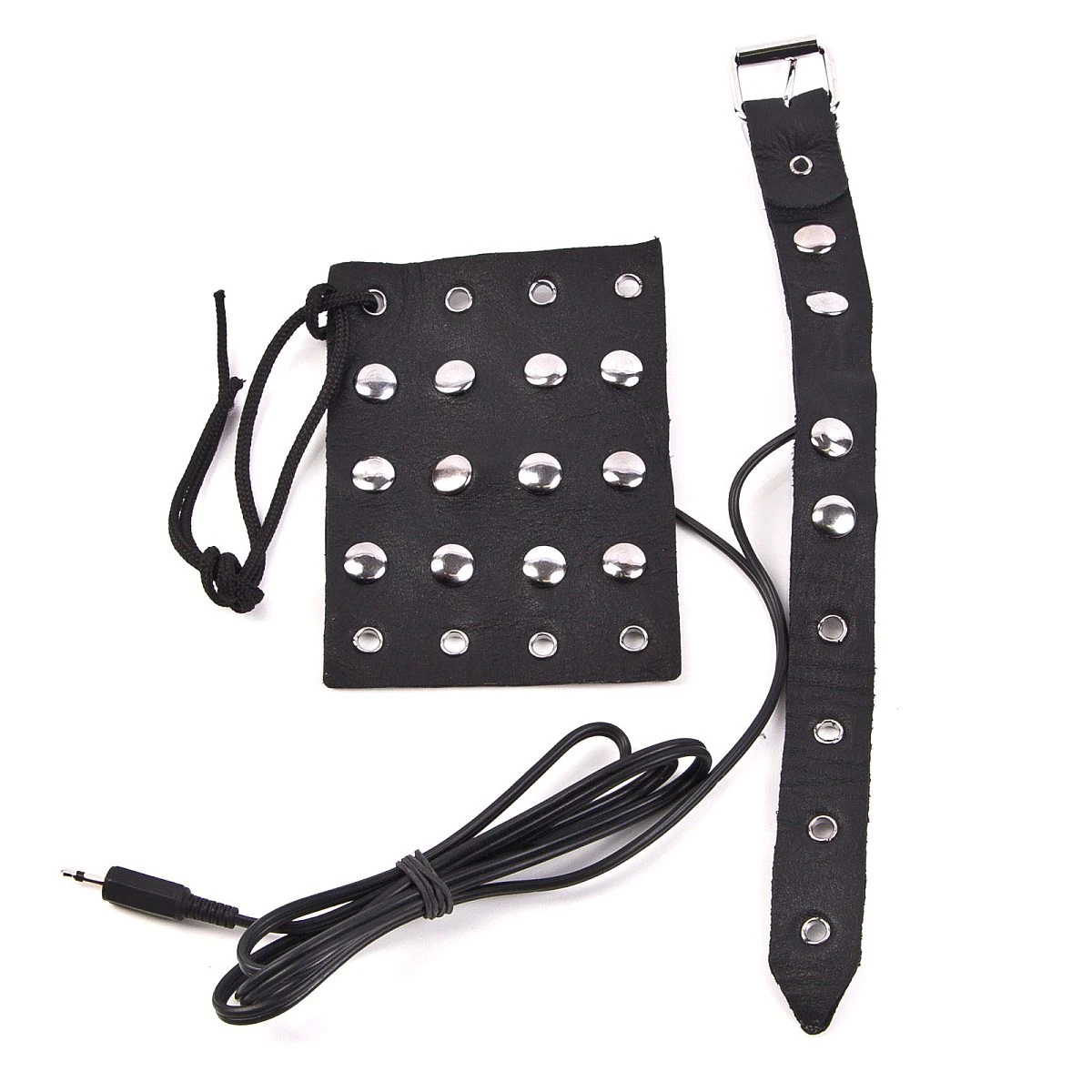 Zur Anwendung: Gebe etwas Elektroden-Gleitgel auf die Nieten an der Innenseite, wickle die Penismanschette um Deinen Penis und ziehe sie mit der Schnürung auf die gewünschte Enge. Die Hodenmanschette kommt ebenfalls mit Gleitmittel um Deine Hoden und wird mit der Rollschnalle verschlossen.