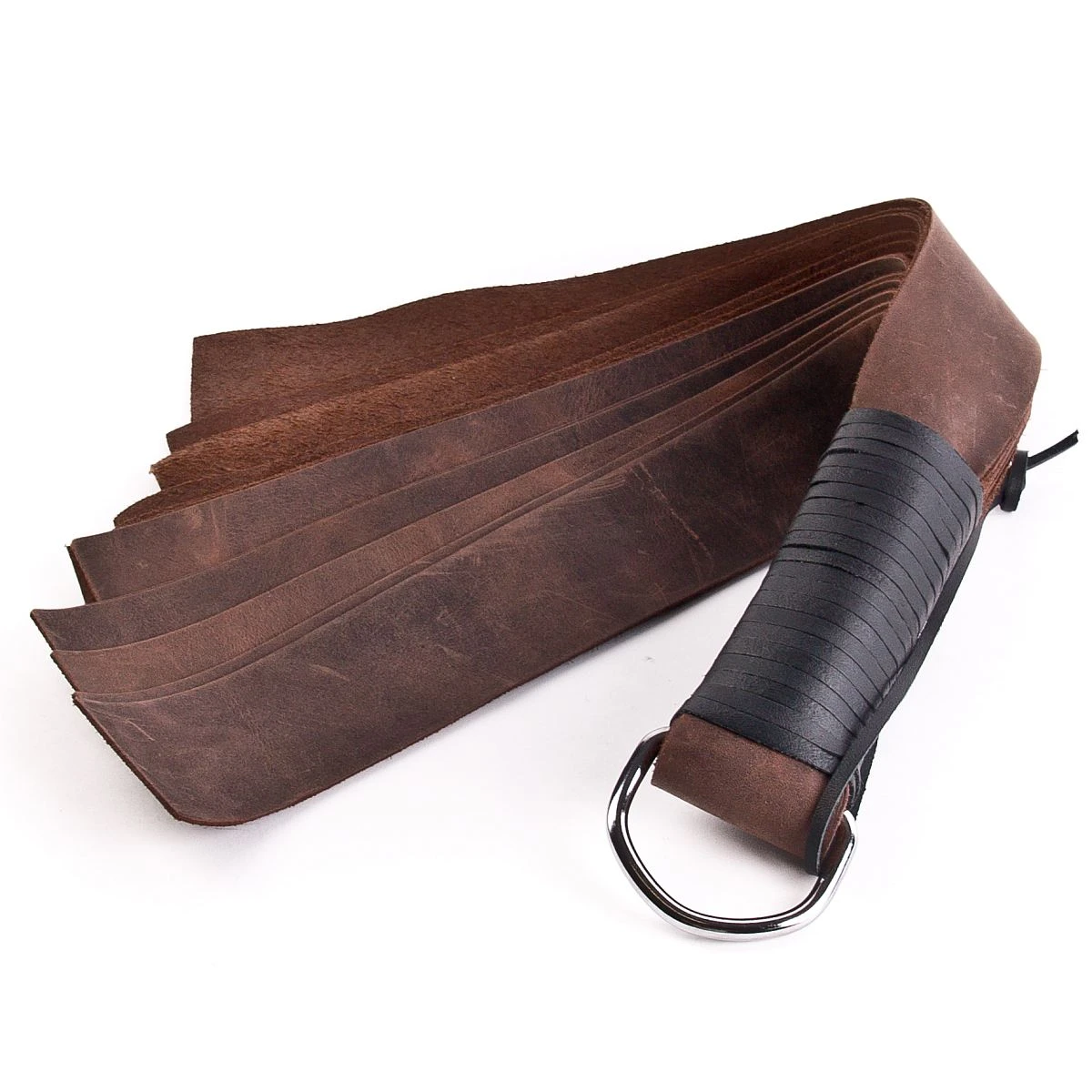 Der wunderbare, robuste Riemenflogger »Pure and Heavy« sorgt mit seinen 12 breiten Riemen aus schwerem braunem Rindsleder für ein deftiges Auftreffen auf die Haut. Die Schläge gleichen einer sehr kräftigen Massage, dennoch kann man es mit diesem Flogger auch durchaus „knallen lassen“ also bitte aus Rücksicht auf den Nachbarn nicht allzu heftig zuschlagen ^^.