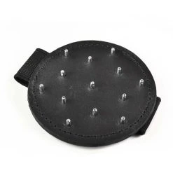 Das schwarze Lederpad mit Spikes, die abgerundet sind hat an der Rückseite ein breites Stretchband. So kannst Du es wie einen Handschuh anlegen und damit über die Haut gleiten. Du kannst auch damit schlagen, was natürlich einen größeren Aha-Effekt erzeugt als die bloße Hand 😉.