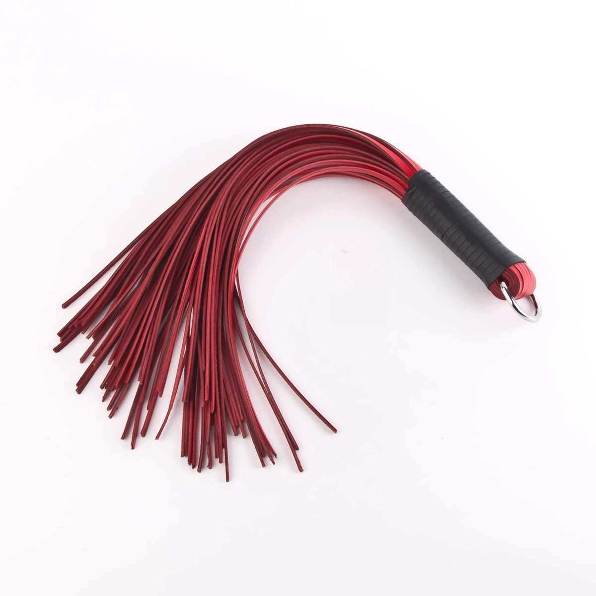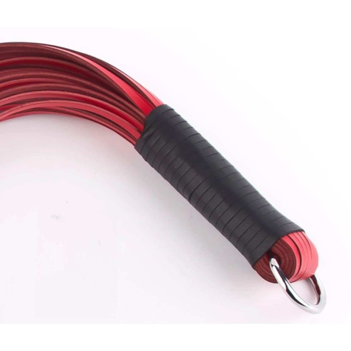 Groß und kräftig ist dieser Flogger aus stabilem, duftendem, italienischem Rindleder. Der Griff ist mit schwarzen Lederstreifen umwickelt und endet in einem geschweißten D-Ring.