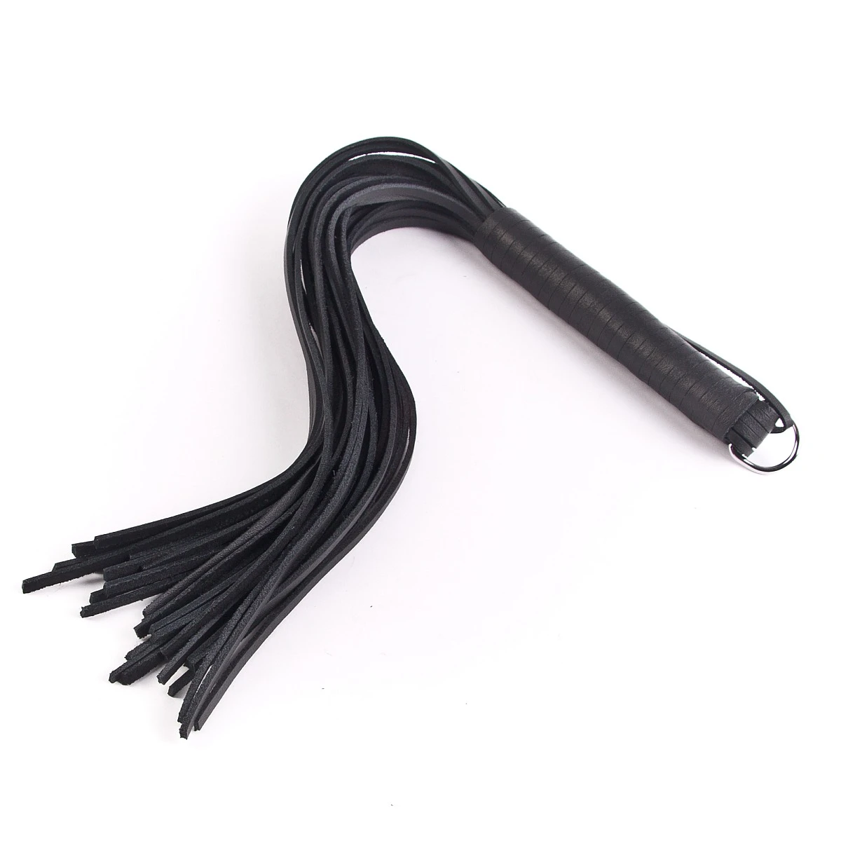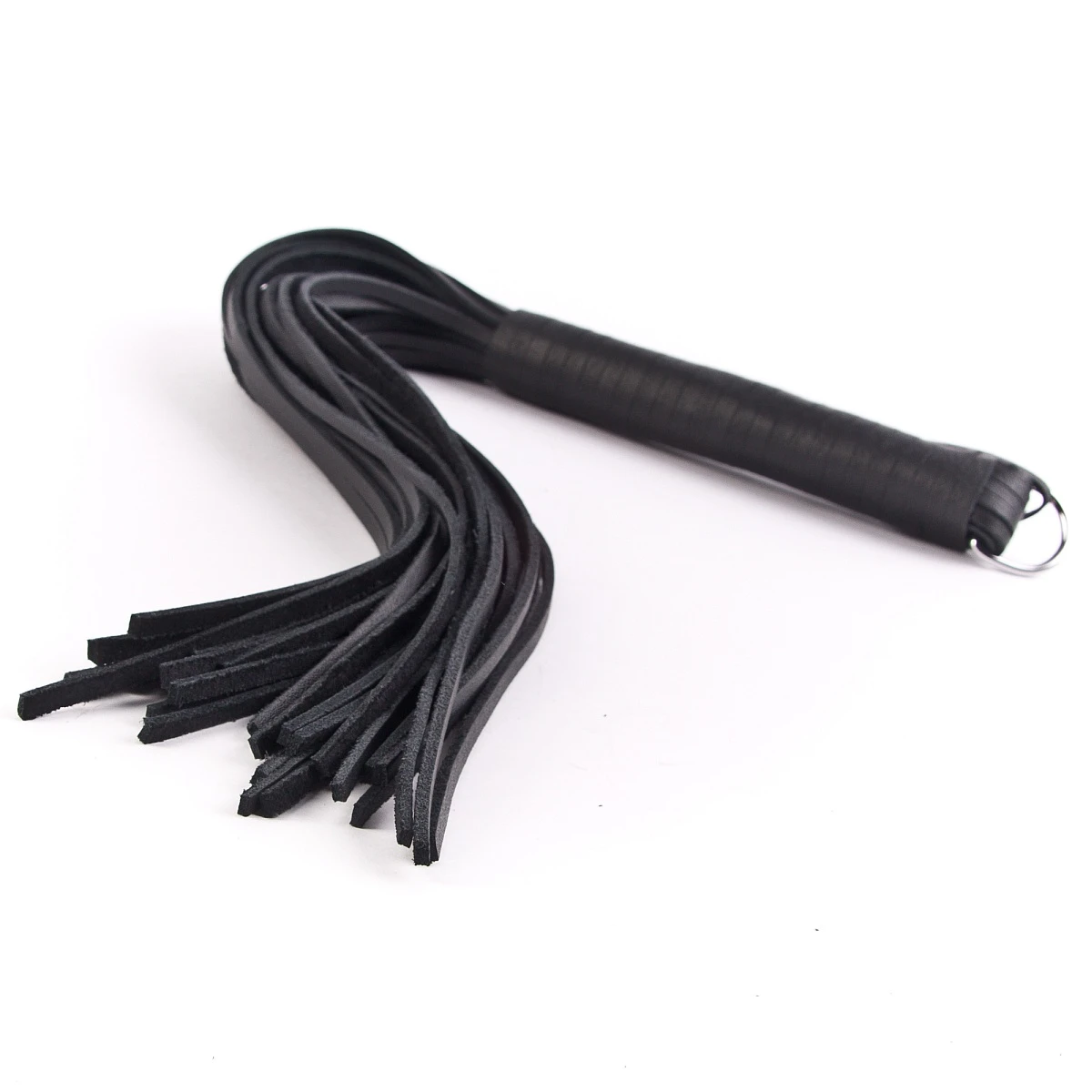 24 feste Riemen – die zieht durch! Flogger aus stabilem, duftendem, italienischem Rindleder. Der Griff ist mit schwarzen Lederstreifen umwickelt und endet in einem D-Ring.