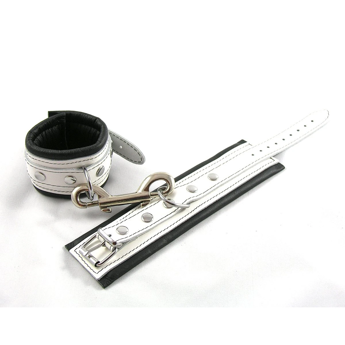 Für zierliche Handgelenke ist diese schmalen Lederfessel in weiß – schwarz aus hochwertigem Rindleder. Die Handfesseln sind natürlich größenverstellbar. Der verschweißte D-Ring sitzt sicher vernietet unter dem weißen Lederband. Innen sind die Manschetten gepolstert und ebenso wie der weiche Rand mit schwarzem Glatteder verarbeitet.