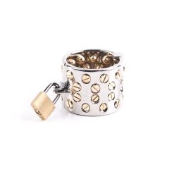 Anwendung: zuerst kannst du die Schraubdornen soweit herausdrehen, dass der Ring innen glatt ist. Dann klappst du den Ballcrusher auf, legst ihn um die Hoden und schließt ihn mit beiliegendem Schloß ab. Je nach Belieben können die Dornen dann weiter nach Innen gedreht werden. Ein kompakter Schraubendreher liegt bei.