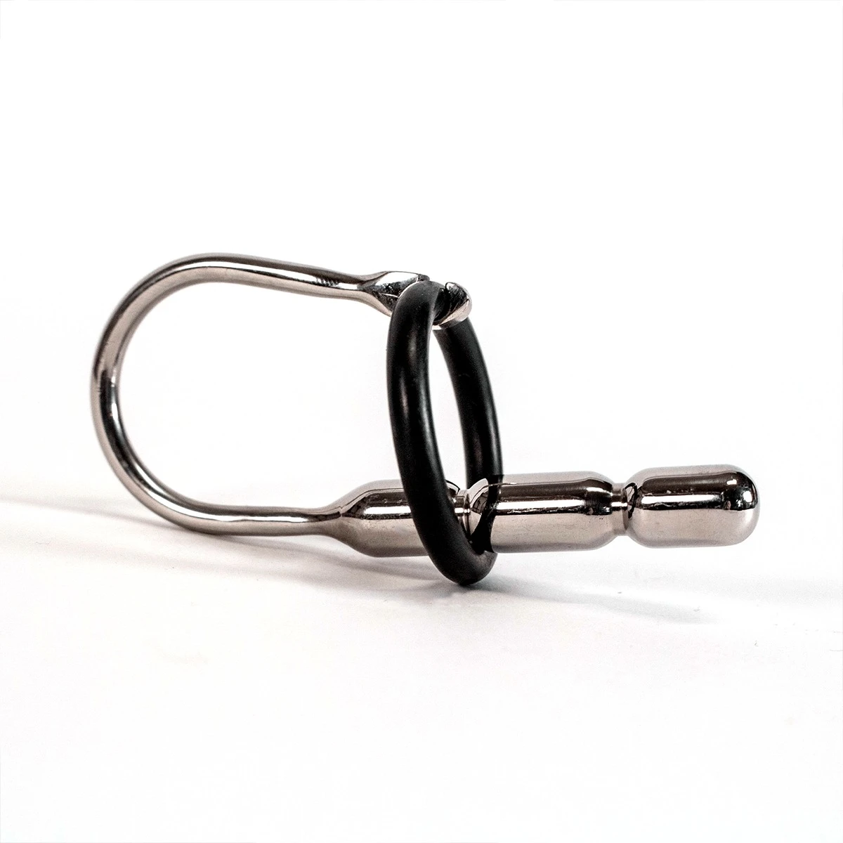 Der Eichelring wird über den Eichelkranz geschoben und das Endstück des Bügels mit dem Penisplug dabei in die Harnröhre eingeführt.