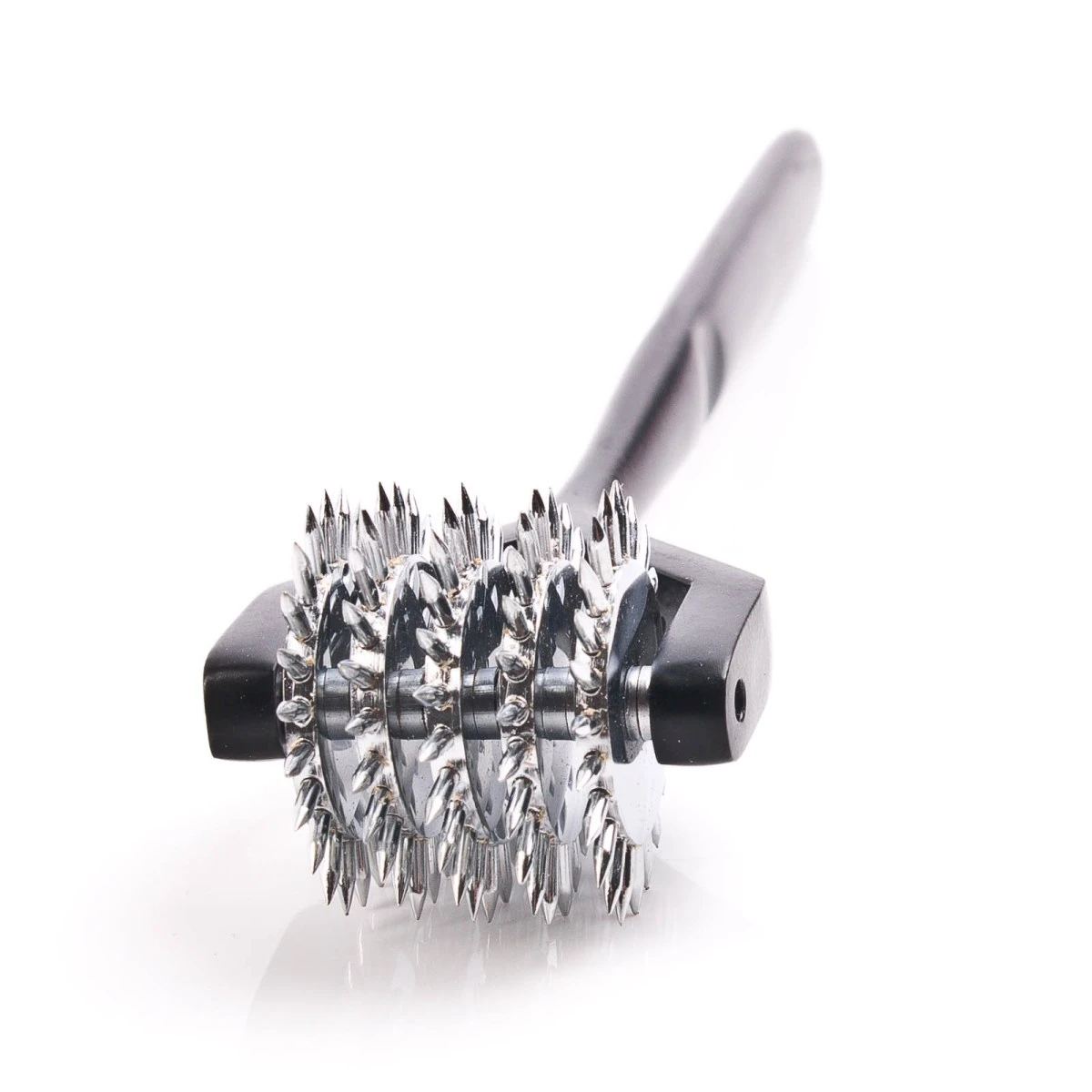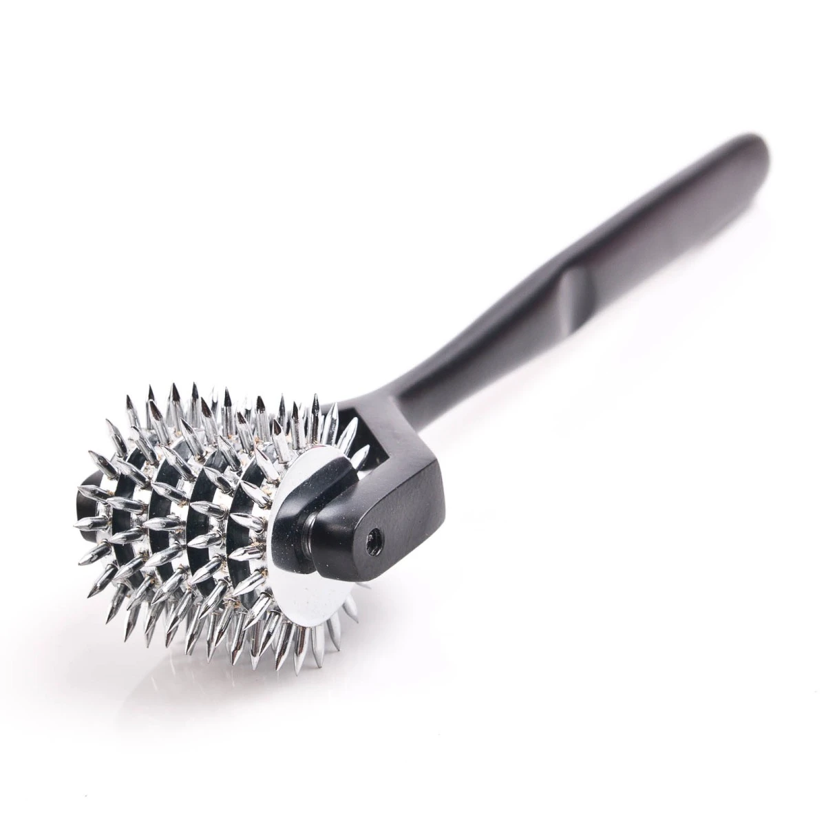 Dieses Nadelrad nach Wartenberg hat fünf Räder. Die Rädchen sind verchromt, der Griff ist schwarz. Nadelspitz ziehen die 5 Rädchen rollend ihre Bahn über Deine Haut und verursachen ein wohliges Gänsehautgefühl, wenn sie sachte dahingleiten. Stärker aufgedrückt, womöglich auf sehr empfindlichen Stellen Deines Körpers? Dann wird Dir der Atem stocken. Aber keine Angst, sie sind nicht so spitz, dass sie die Haut ernsthaft verletzen.