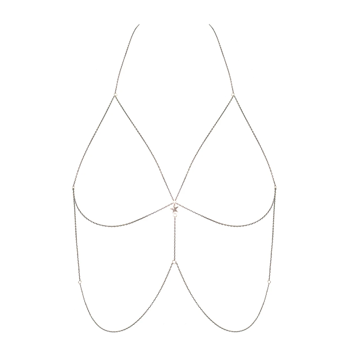 Der leichte Ketten-Body mit einem kleinen goldfarbenen Stern in der Front steht jeder Person. Das Anlegen wird durch zwei Schmuckkarabiner im Rücken erleichtert.