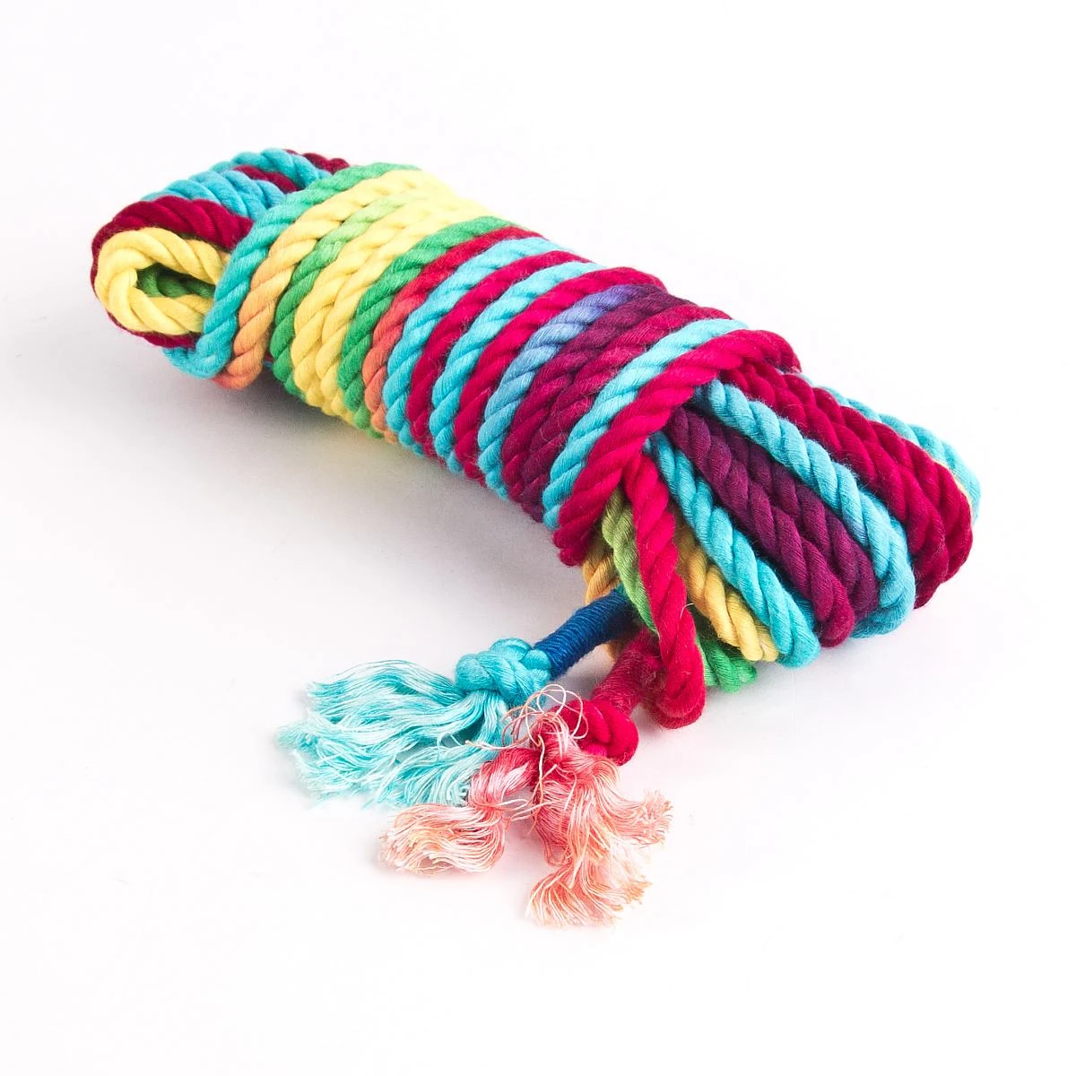 Unser Regenbogen-Bondageseil ist in zwei unterschiedlichen Färbungen erhältlich: Außer dem hier beschriebenen »Rainbow-Rope Konfetti« in kräftig-leuchtenden Farben verfügt das »Rainbow-Rope Einhorn« über eine kräftige pastellige Optik.