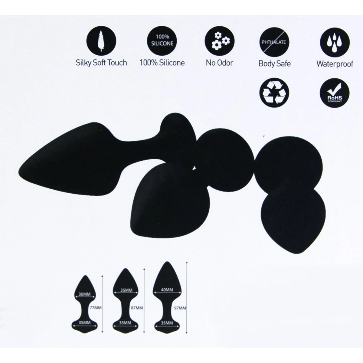 Drei Analplugs im Set. Angenehmes Material, tolle Haptik, kein Geruch und dazu ein super Preis. Hier kann man ausprobieren, variieren, Spaß haben. Da ist für jede/n der passende Butt Plug dabei. Die Plugs dieser Serie haben einen dünnen „Stiel“. Der sorgt dafür, dass der Schließmuskel während dem Tragen nicht gedehnt wird. Das fühlt sich einfach besser an. Der runde Griff am Ende dient als „Stopper“ damit das gute Stück nicht an innen rutscht.