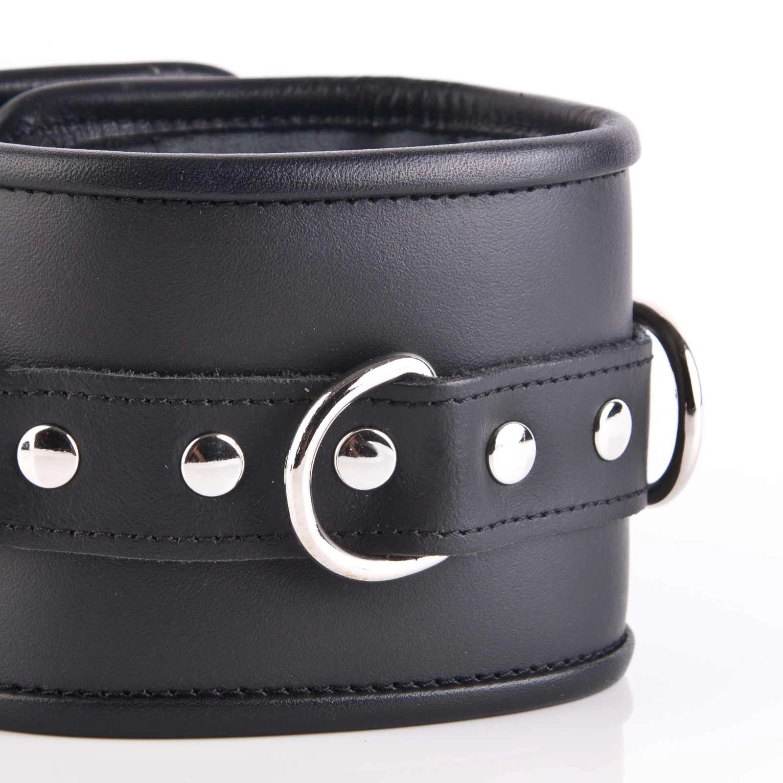 Das breite Lederhalsband ist aus hochwertigem Rindsleder gefertigt und wurde mit vier eingearbeiteten D-Ringen versehen. Innen ist es dünn gepolstert und mit Veloursleder weich gefüttert, welches auch nach langer Tragezeit nicht auf die Haut abfärbt. Die Ösen sind umnietet und können so mit einem kleinen Schloss* gesichert werden, das Du auch in unserem Shop findest.