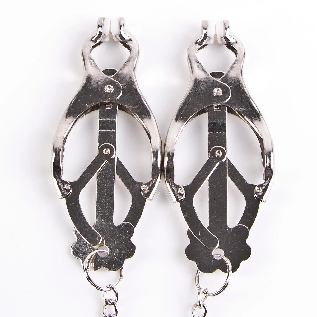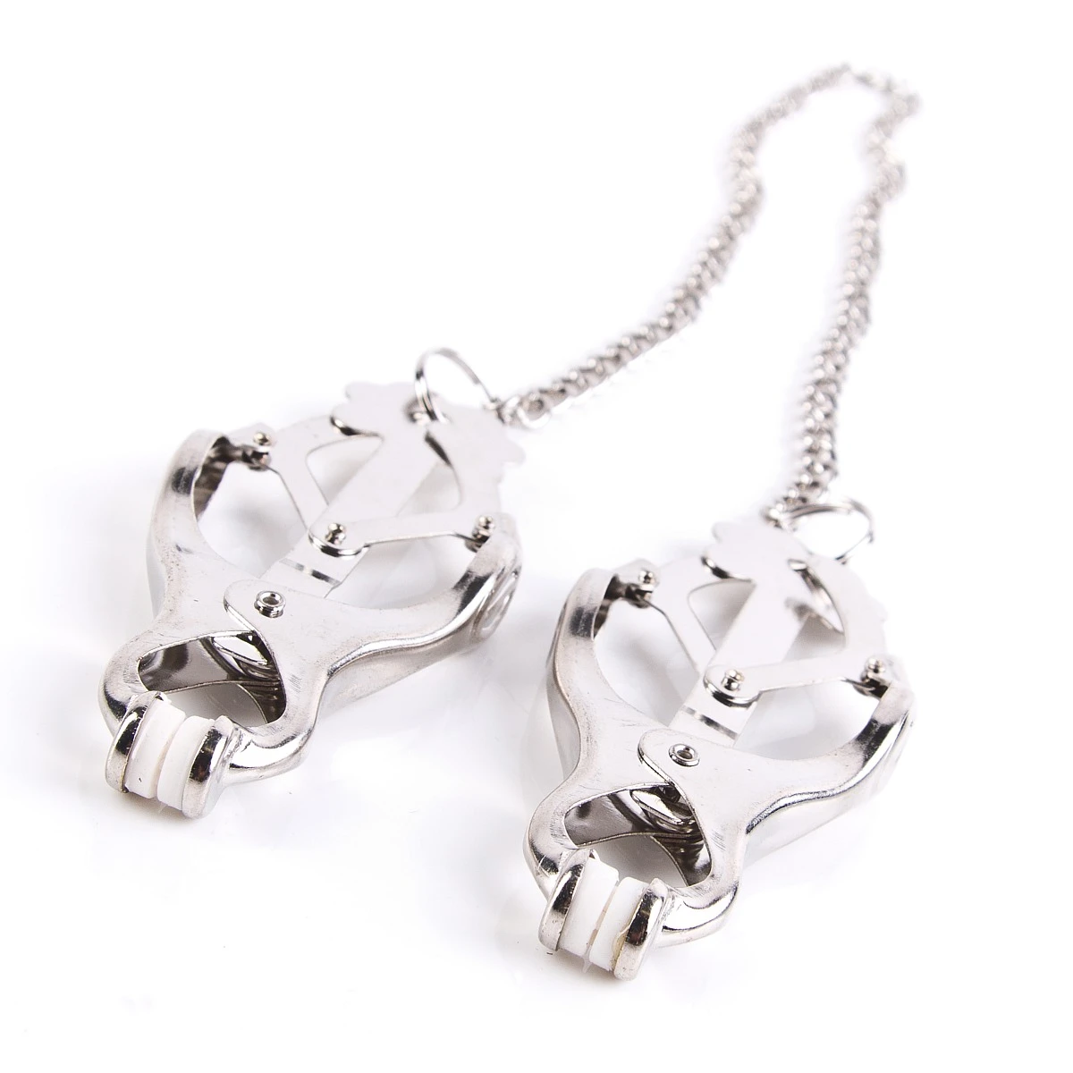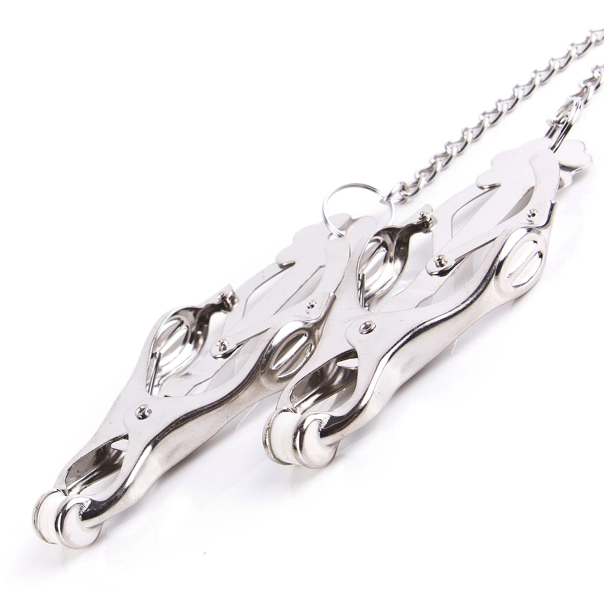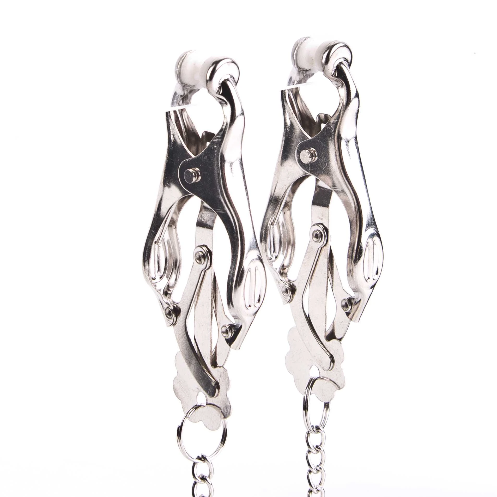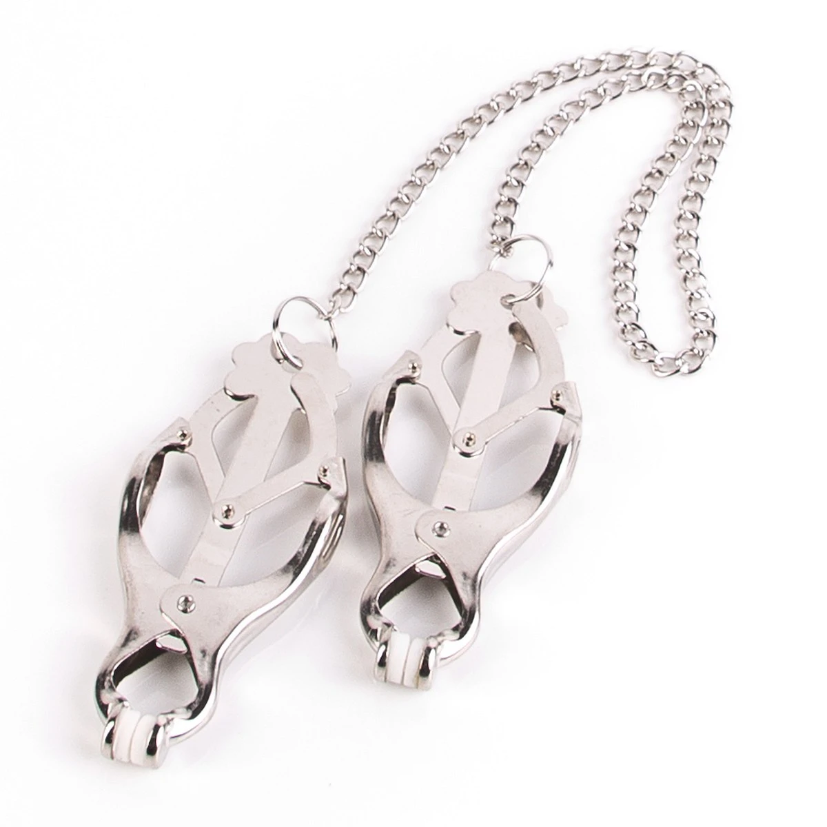 Neue, verbesserte Variante: die traditionellen Clover Clamps werden auch als Japanische Klammern bezeichnet und haben eine verbindende Kette. Diese hat nicht nur eine schmückende Funktion: Du kannst die Klammern beschweren, in dem Du dort Gewichte einhängst. Auch ein Seil kann man dran befestigen, damit Subbie einen passenden Parkplatz im Club findet oder Dir brav hinterher läuft. Diesen Klammern kann man sich einfach nicht entziehen!