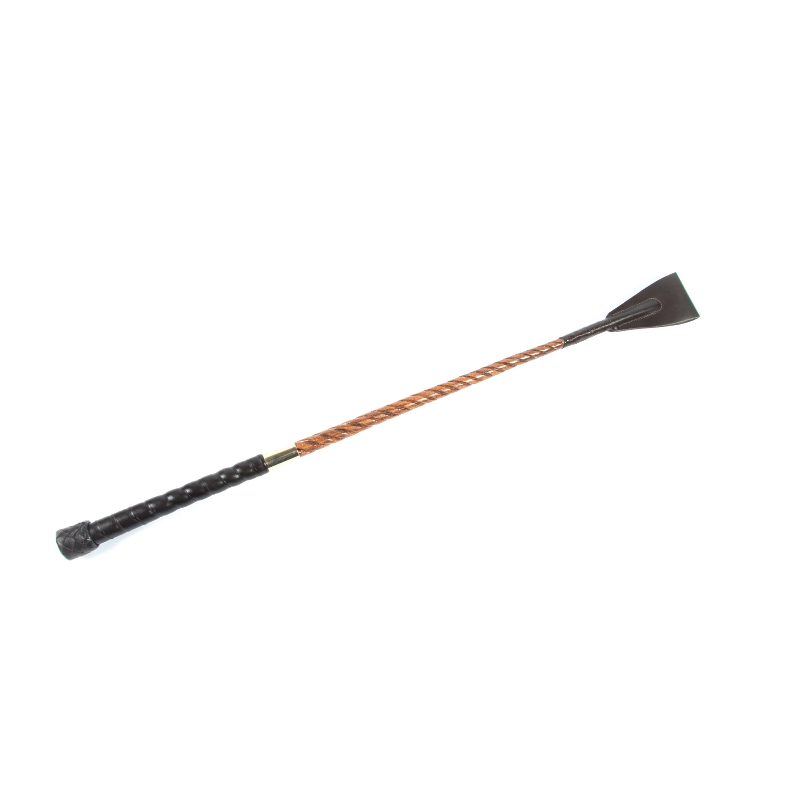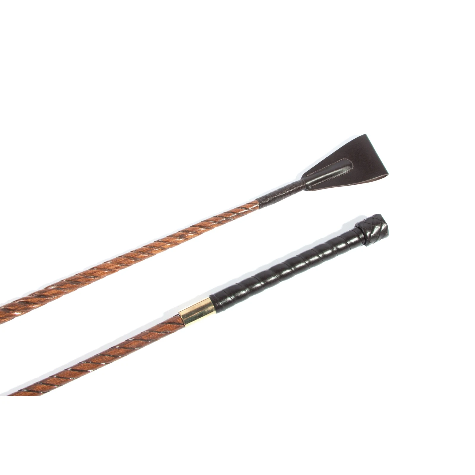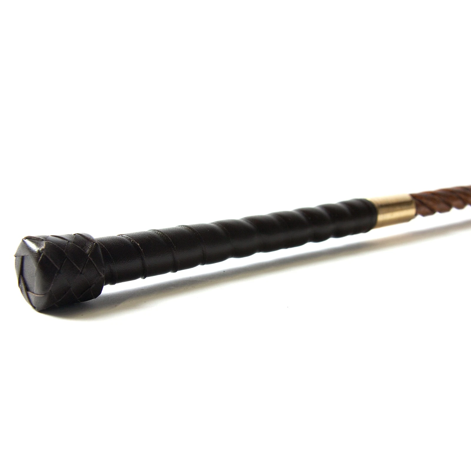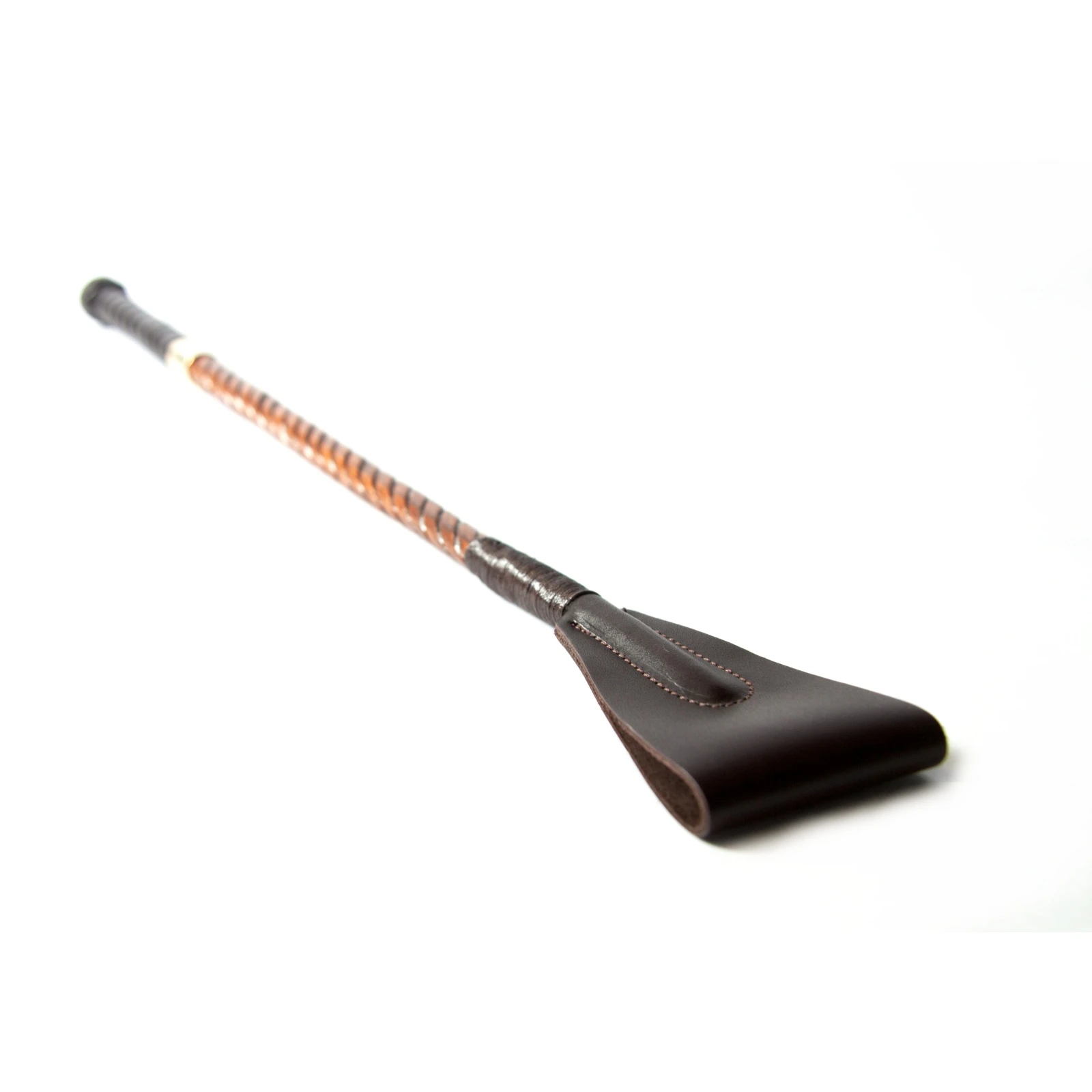 Die Gerte aus Sulgenholz ist ein Klassiker der Handwerkskunst. Sie wurde einem der ältesten Züchtigungsinstrumente nachempfunden. Das Sulgenholz wird aus einem Stück hergestellt und oberhalb des Griffs in 4 Teile gespalten. Diese werden in einem aufwändigen Prozess ineinander verdreht. Dadurch wird die Sulgenholzgerte biegsam und elastisch. Das Holz ist dunkel gebeizt und lackiert. Die Klatsche ist aus braunem Leder. Eine antik-messingfarbene Hülse bildet den Ü’bergang zum Griff. Der Griff ist mit edlem Leder überzogen und hat ein geflochtenes Ende.