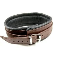 Innen ist das Halsband mit schwarzem Glattleder gefüttert. Mit der Haut kommen keine Metallteile in Berührung. Der Rand ist doppelt genäht und weich; so reibt das Halsband nicht auf der Haut. Die Ösen sind umnietet und können so gegen unbefugtes Ausziehen mit einem kleinen Schloss gesichert werden.