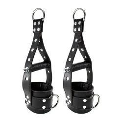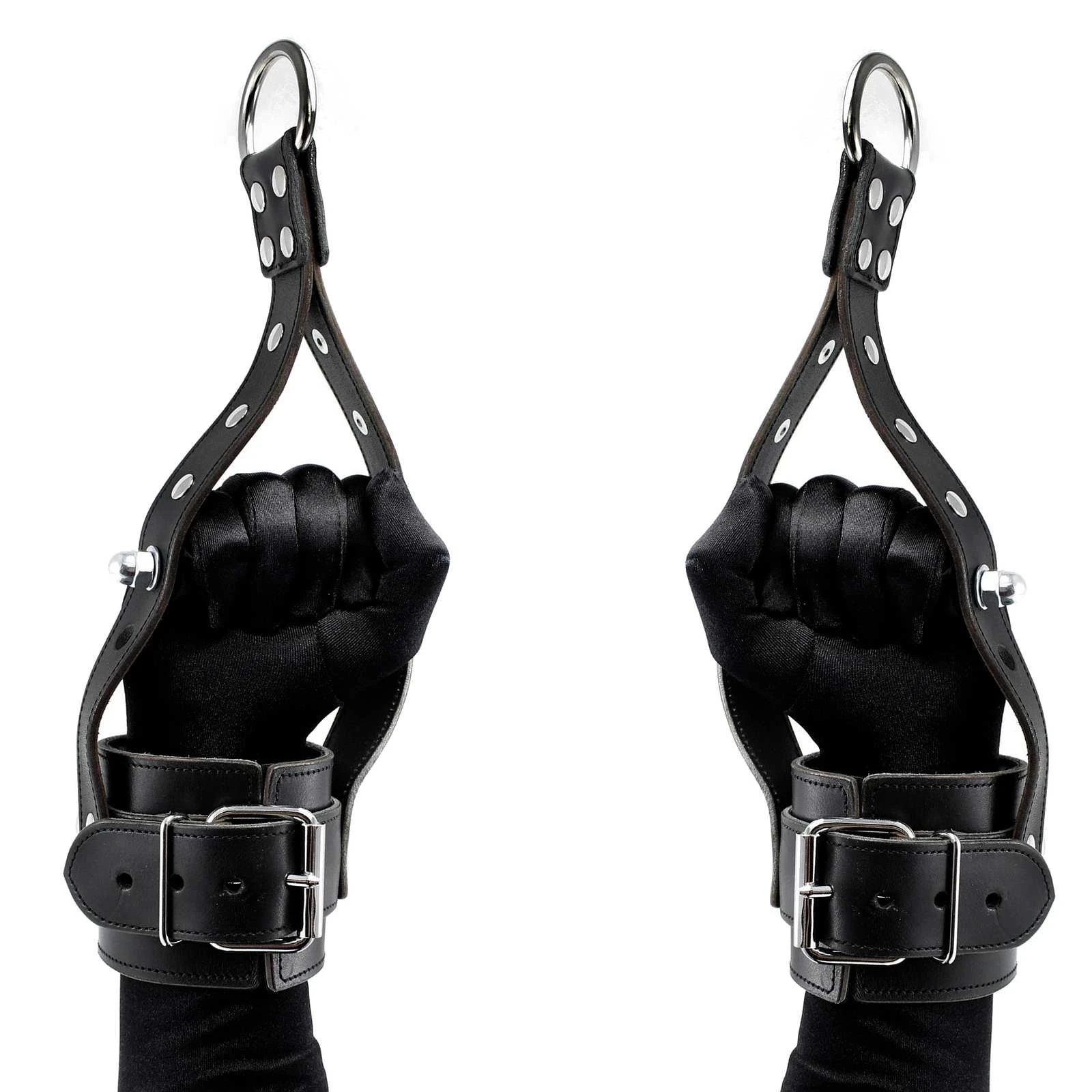 Diese Hand-Hängefesseln begeistern durch die hervorragende Verarbeitung. Sie sind mit weichem Leder dick und bequem gefüttert. Die Befestigung zwischen dem Hängeriemen und der Handmanschette besteht je Hängepunkt aus vier Nieten. Die stabilen Haltegriffe aus Metall sind ebenfalls mit Leder umschlossen und vermitteln so ein gutes und sicheres Gefühl. Die Griffe sind im Abstand zur Manschette höhenverstellbar. Diese Fesseln sind sehr stabil und mit einer Rollschnalle zu schließen.