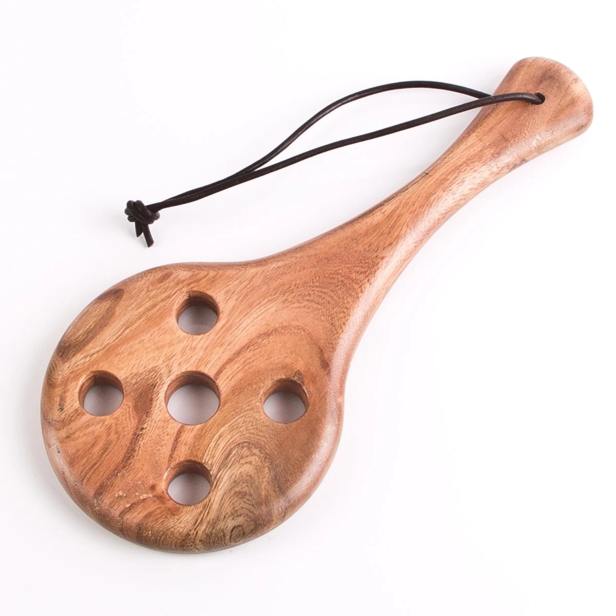 Wenn Subbie mal wieder die Grenzen ausloten will, ist dieses Holzpaddel das Mittel der Wahl. Wir übertreiben nicht, wenn wir es zu unseren heftigsten Paddeln in unserem Sortiment zählen. Die unnachgiebige Materialbeschaffenheit des Holzes sorgt zusammen mit einem gewissen Eigengewicht für ordentlich Wumms hinter den Schlägen. Die Löcher in der Schlagfläche verhindern die Bildung eines Luftpolsters, das die Schlagenergie abbremsen könnte. So trifft das Paddel »Bullseye« mit voller Wucht des Schlages auf den Po des Gegenübers. Durch die Löcher wird auch die Lautstärke der Klatschgeräusche abgemildert, was Dich aber nur dazu verleiten wird, noch härter zuzuschlagen. Außerdem hinterlassen die Löcher schöne Muster auf der geröteten Haut. Man will ja auch danach noch etwas länger davon haben