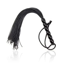 Der Griff besteht aus 6 Kunststoffperlen, die die Silikonschnüre eng umschließen, den Abschluss bietet eine Handschlaufe, an der die Peitsche bequem aufgehängt werden kann.