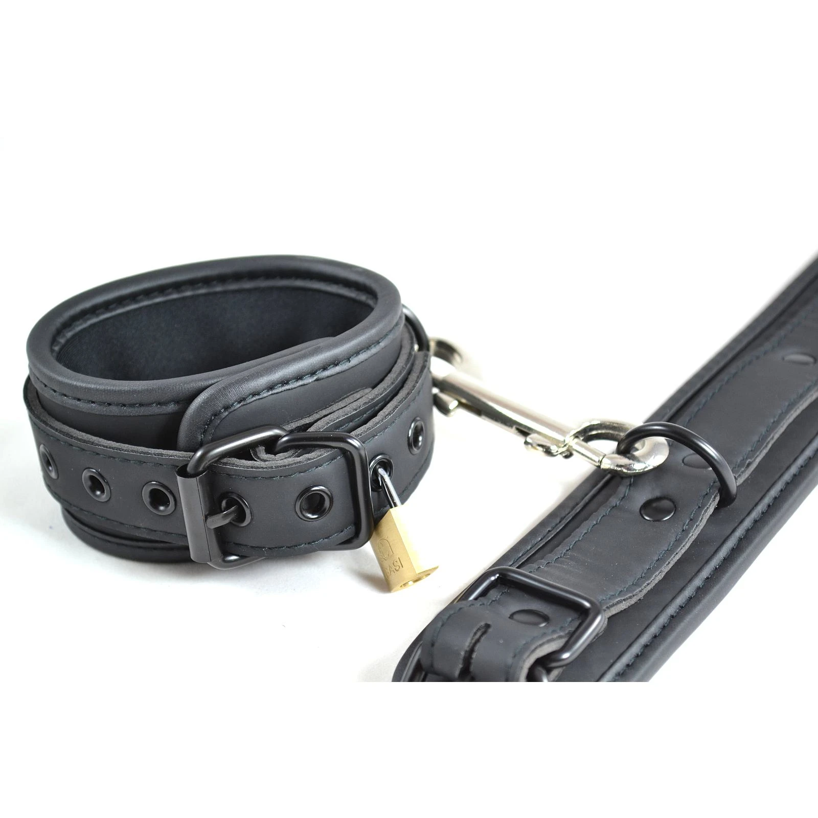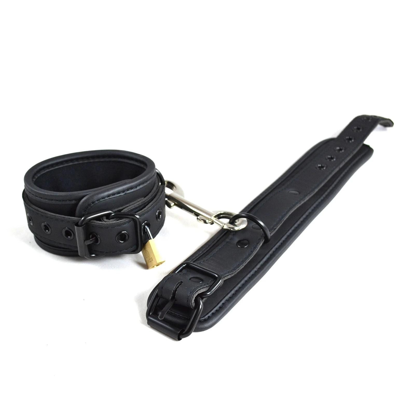 Diese Fesseln sind geschnitten wie klassische Fußfesseln aus Leder. Die Metallteile sind schwarz, ebenso der D-Ring. Das Verschlussband ist 3-fach genietet, die Nieten liegen unter der Polsterung und nicht auf der Haut. Innen sind die Fesseln mit weichem Stoff überzogen. Der Rand ist weich umnäht. So sind sie auch für lange Bondage-Sessions geeignet, ohne dass man taube Hände bekommt oder sich die Haut aufscheuert.