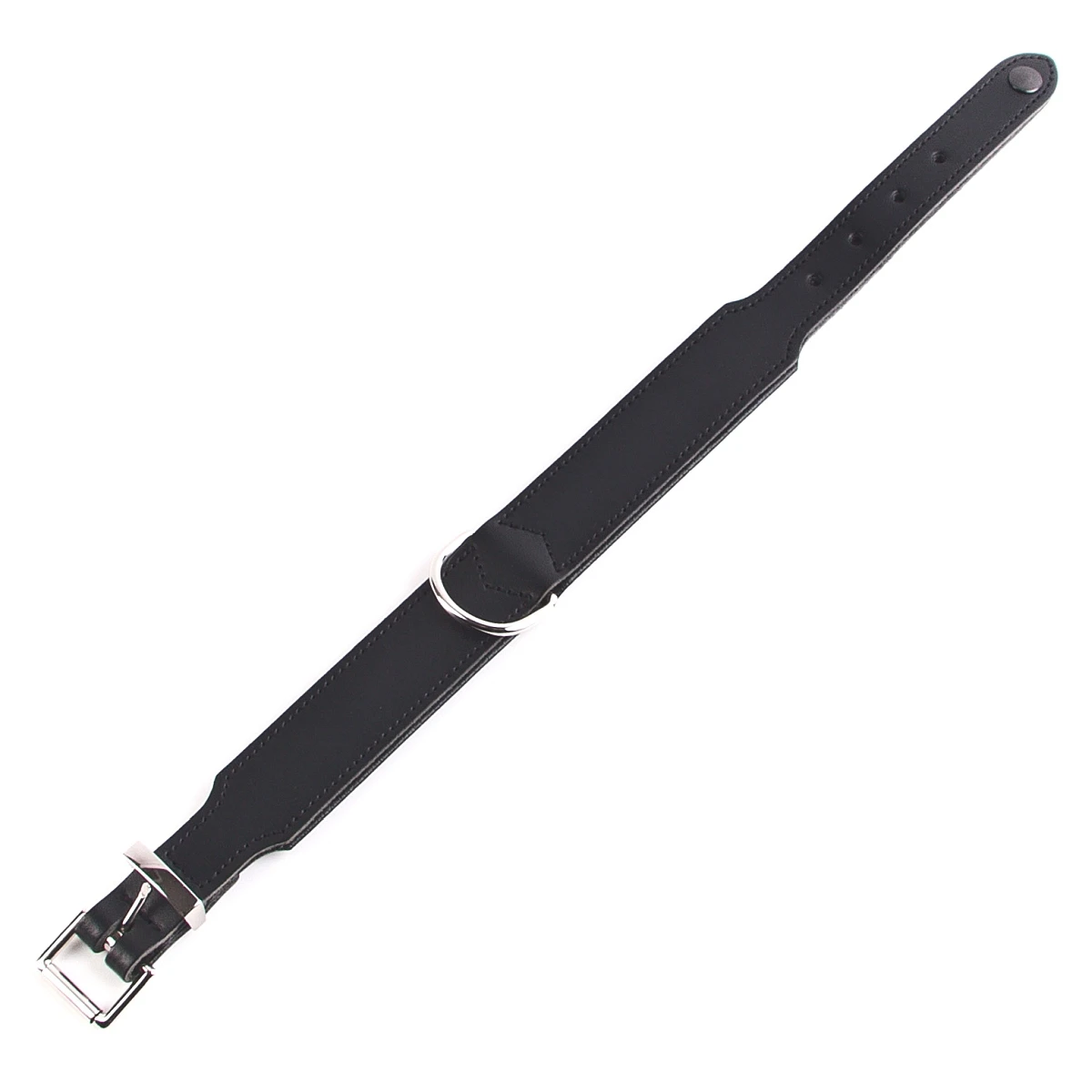 Der integrierte, stabile D-Ring aus Metall ist zwischen den beiden Lederlagen eingenäht und ist nicht wie bei vielen anderen Halsbändern üblich vernietet. Dies tut der Robustheit aber keinen Abbruch an diesem Ring kann auch gerne mal kräftiger gezogen werden. Er bietet sich zum Einklinken von Karabinerhaken an einer Führleine, einem Bondageseil oder mittels Ketten o. ä. auch für die Befestigung von Hand- oder Fußmanschetten an.