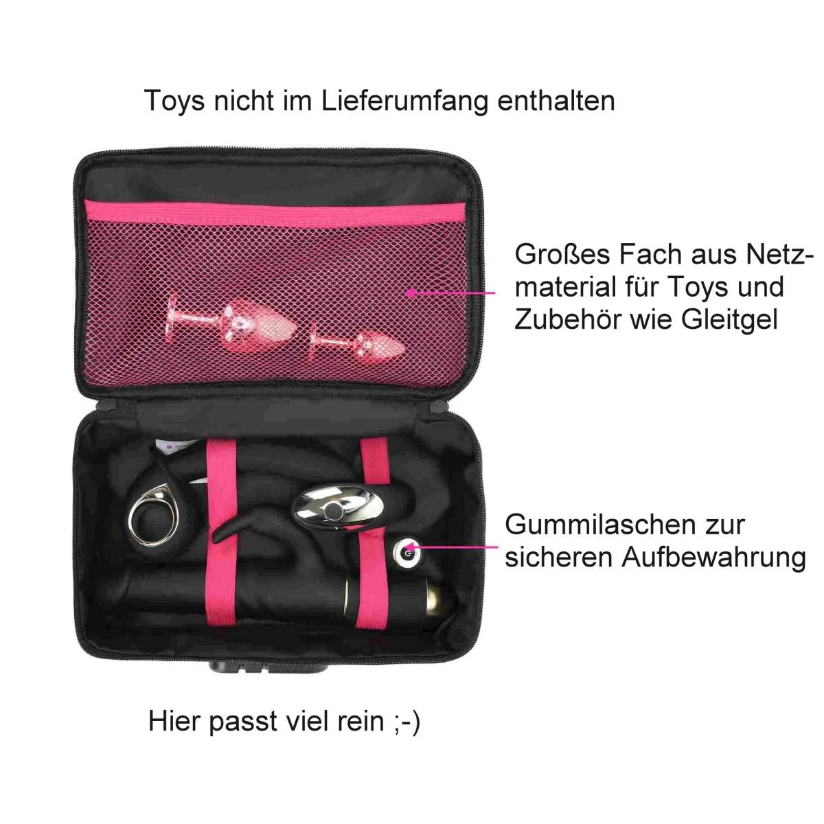Das Design in mattem Schwarz fügt sich harmonisch und diskret überall ein und wirkt wie ein Reisenecessaire. Die Größe ist so bemessen, dass 4-5 mittelgroße Toys wie Vibratoren, Masturbatoren und Dildos samt Reinigungsmittel hineinpassen. Innen sind Gummibänder, die die Toys und Zubehör gut halten und in die Netztasche können Ladekabel und Plugs.