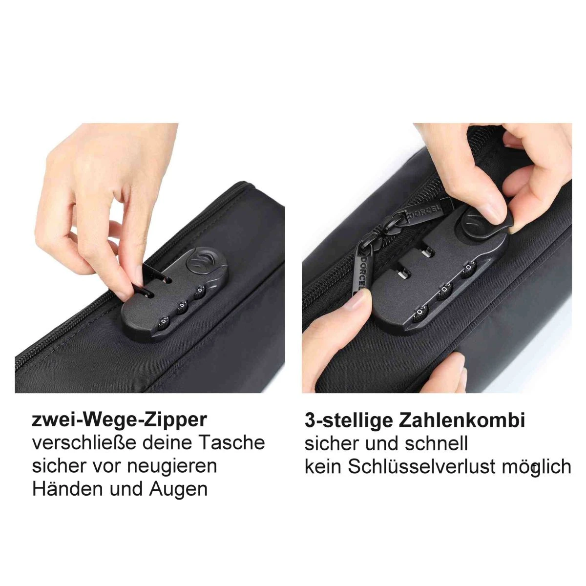 Die Tasche hat an der Oberseite einen Griff aus Nylongewebe und einen 2-Wege-Reißverschluss, den man mit fest integriertem Zahlenschloss vor neugierigen Augen und Händen schützen kann. Das große Fach der Tasche hat ein Futter aus Baumwollsatin, im Deckel ist ein Fach aus durchlässigem Netzgewebe. Durch das abwischbare Futter ist die »Discreet Box« sehr hygienisch.