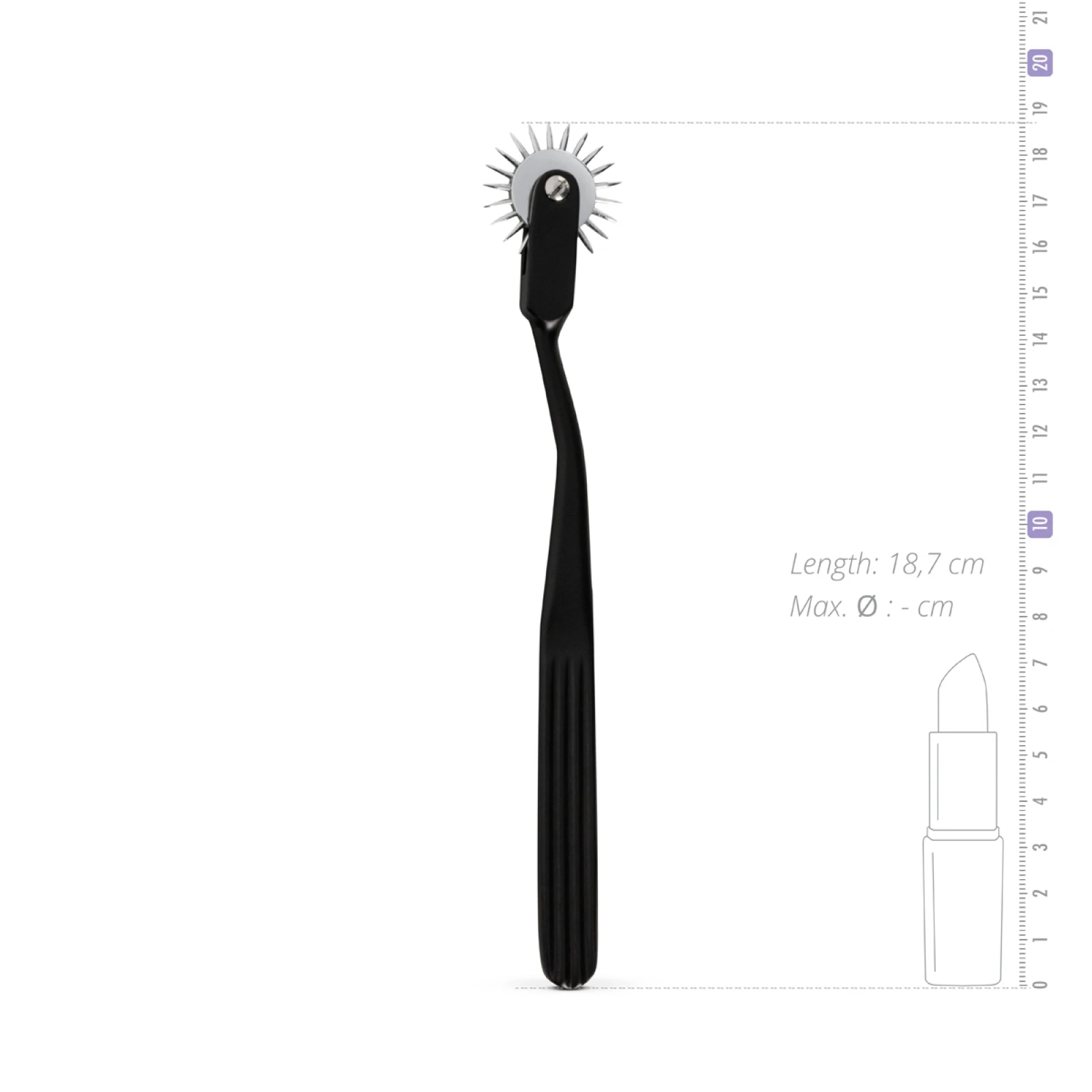 Klassisches Nervenrad nach Wartenberg mit schwarzem Griff. Es spielt seine sensuellen Reize aus, wenn Sub die Augen verbunden hat und das Nervenrad seine Reise über den Körper beginnt. Die funkelnden Nadelspitzen suchen ihren Weg über empfindlichste Körperteile und lassen eine Gänsehaut der Lust auf der Haut erscheinen. Je nachdem wie stark der Druck auf die Haut ist, schwankt das Gefühl zwischen sanften Schauern und nadelspitzem Stechen.