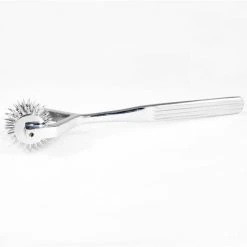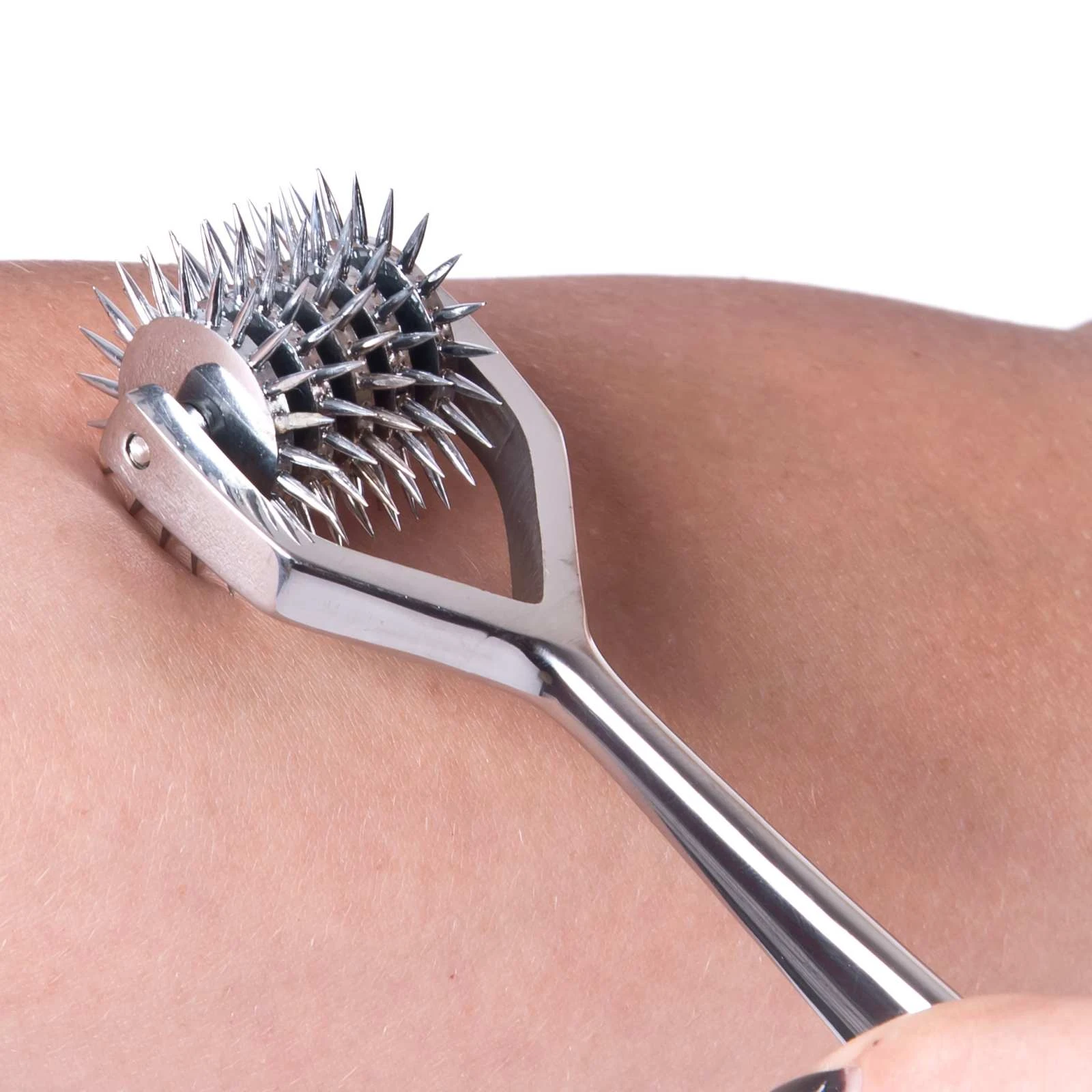 Das Nadelrad nach Wartenberg mit drei Rädern kommt hier ganz in schwarz. Die 3 Nadelräder sorgen für ein wohliges Gänsehautgefühl, wenn sie sachte dahingleiten. Wird stärker aufgedrückt, womöglich auf sehr empfindlichen Stellen deines Körpers? Dann wird dir der Atem stocken. Aber keine Angst, sie sind nicht so spitz, dass sie die Haut ernsthaft verletzen. Überhaupt ist es so, dass ein Nadelrad mit mehreren Rädchen nebeneinander oft als weniger spitz empfunden wird, da der Reiz flächiger verteilt wird. Zudem sind farbige Nadeln eines Wartenbergrads weniger spitz als die stahlfarbenen Rädchen.