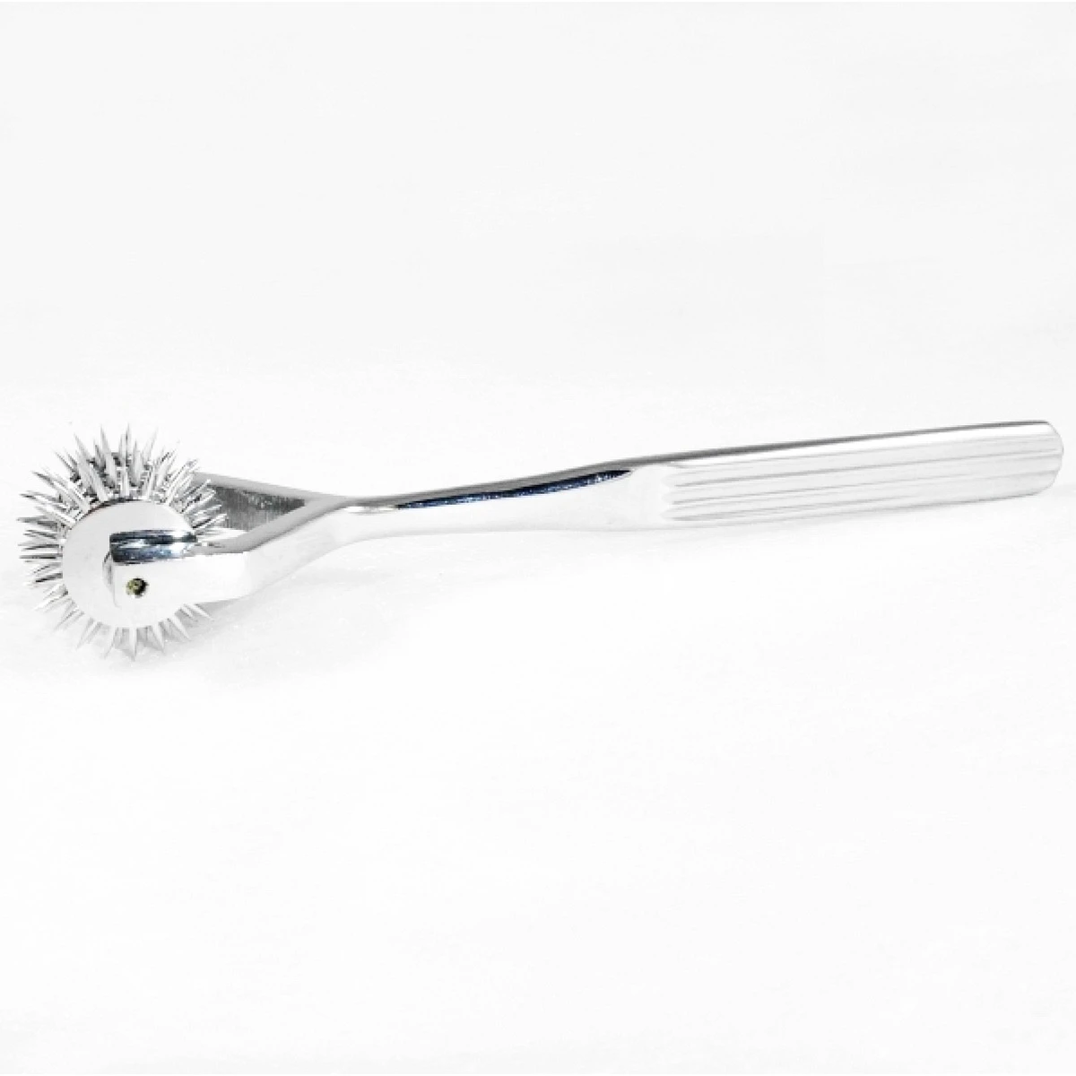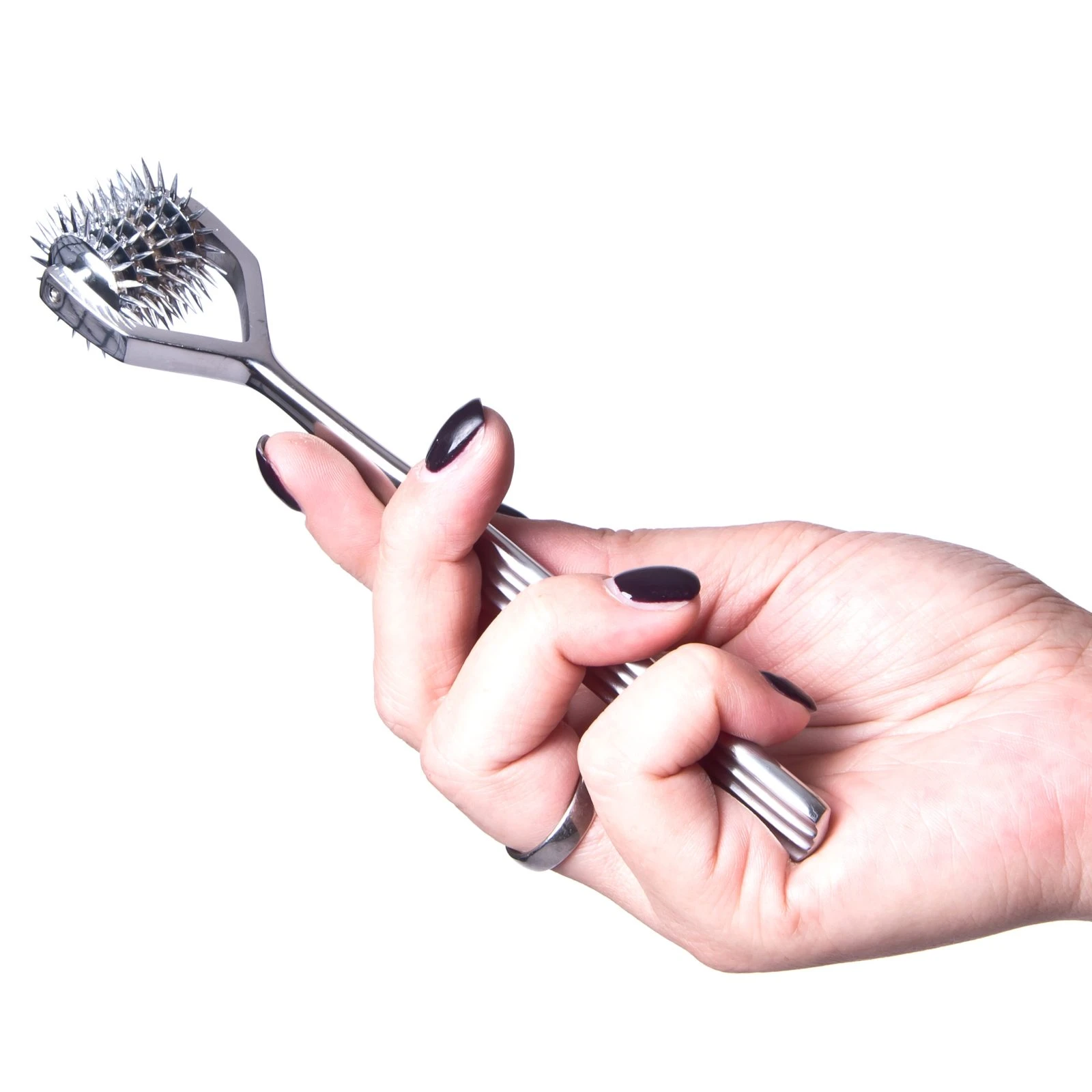 Das Nadelrad nach Wartenberg mit fünf Rädern, die nadelspitz ihre Bahn über deine Haut ziehen. Sie verursachen ein wohliges Gänsehautgefühl, wenn sie sachte dahingleiten. Stärker aufgedrückt, womöglich auf sehr empfindlichen Stellen deines Körpers? Dann wird dir der Atem stocken. Aber keine Angst, sie sind nicht so spitz, dass sie die Haut ernsthaft verletzten. Überhaupt ist es so, dass ein Nadelrad mit mehreren Rädchen nebeneinander oft als weniger spitz empfunden wird, da der Reiz flächiger verteilt wird.