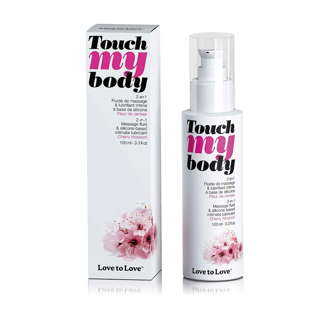 »Touch my body« Massagefluid ist in verschiedenen Duftvarianten erhältlich, z.B. Kirschblüte, Minze, Mandel oder Monoi.