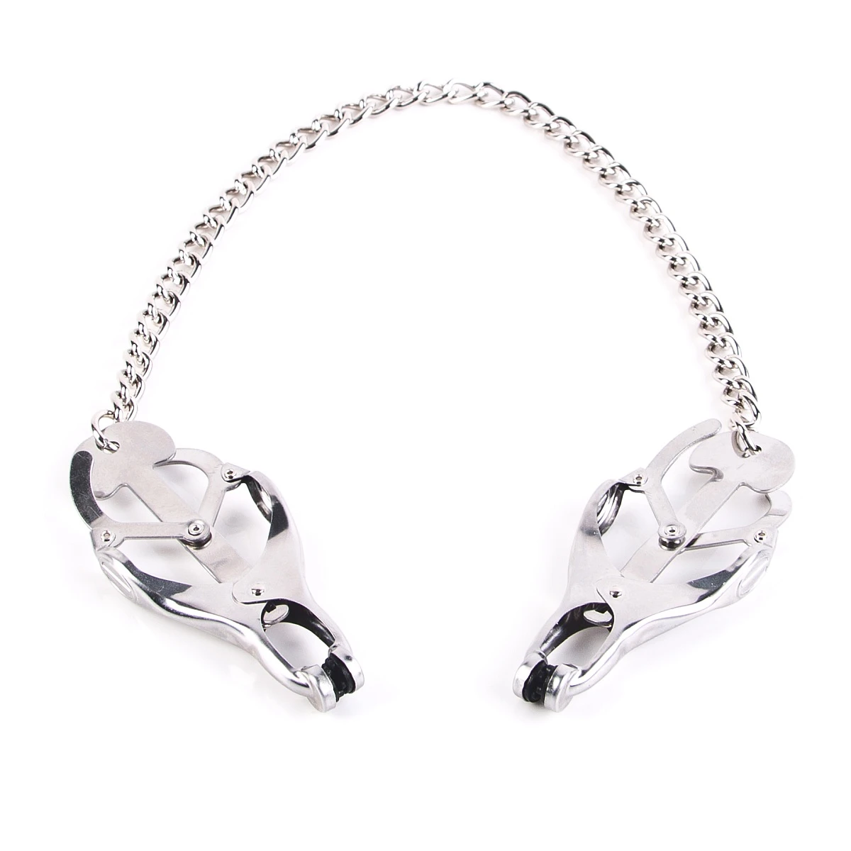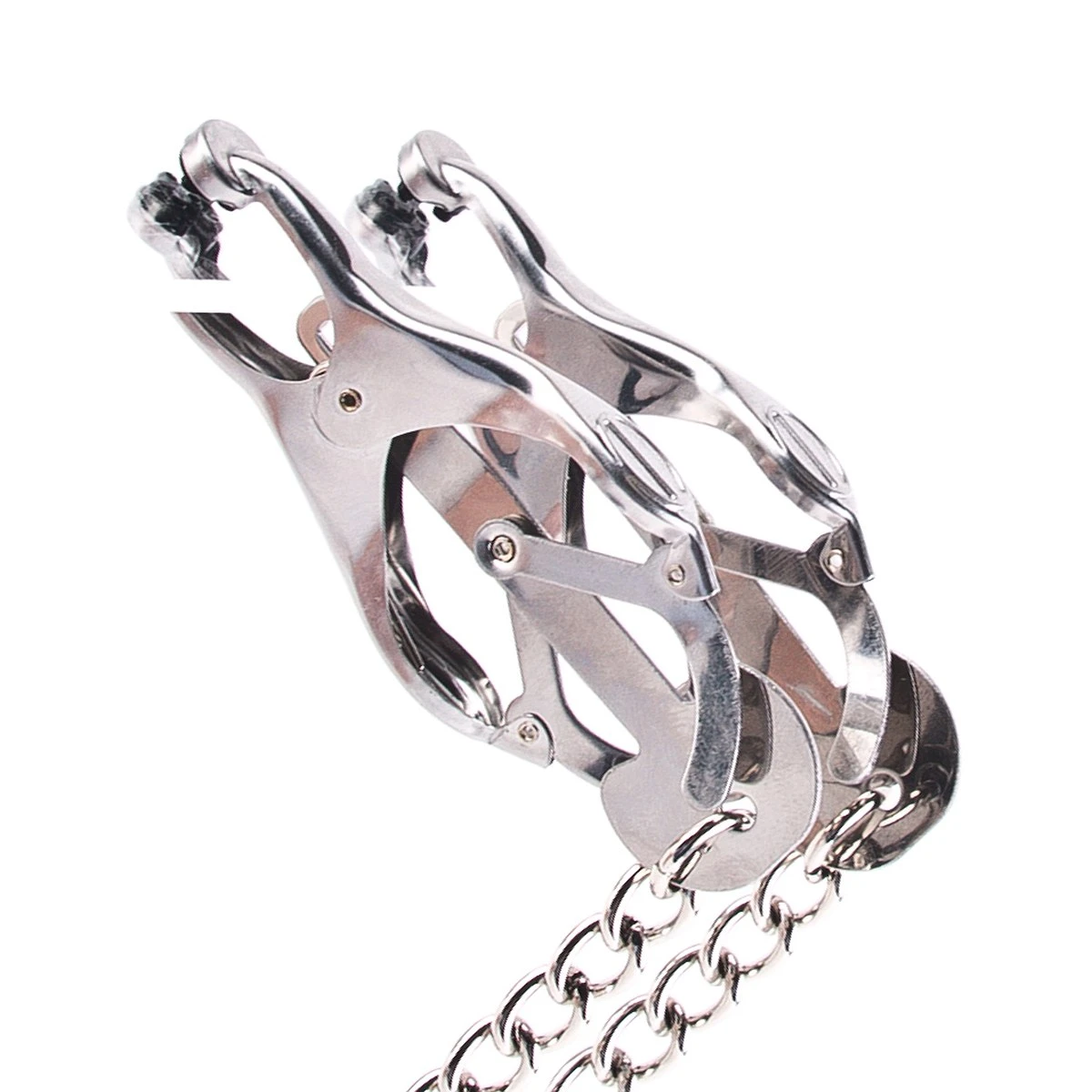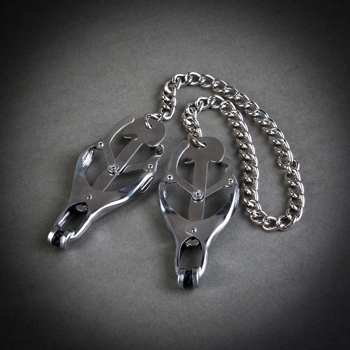 Ein zeitloser Klassiker im BDSM-Bereich sind diese traditionellen japanischen Clover Clamps (Nippelklemmen) mit Brustkette. Einmal angebracht halten sie durch die Noppen auf der recht kleinen Auflagefläche verlässlich fest und verrutschen nicht. Je stärker nun an der Kette gezogen wird, desto fester drücken sich die Auflageflächen der Klammern zusammen. Somit können die Clover Clamps von „aua“ bis „AUA!!!“ auf der Schmerzskala eingesetzt werden, obwohl sie nicht verstellbar sind einzig der Zug an der Kette verändert den Druck.
