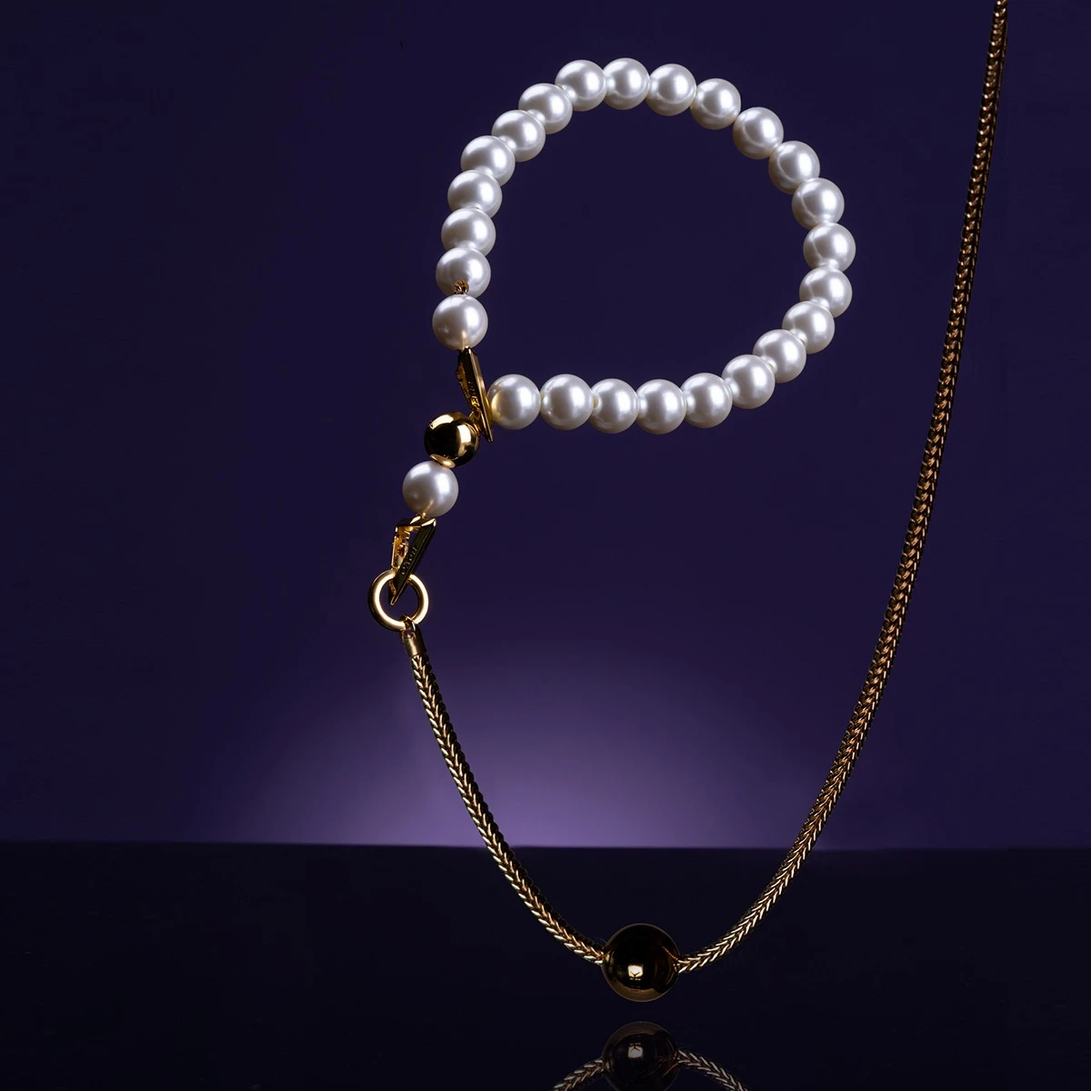 Alle Perlen sind auf eine goldfarbene Kette aufgefädelt, statt auf den üblichen Faden. Damit ist das Collier so stabil, dass es auch als Halsband dienen kann, an dem du die beiliegende Führleine einklinken kannst.