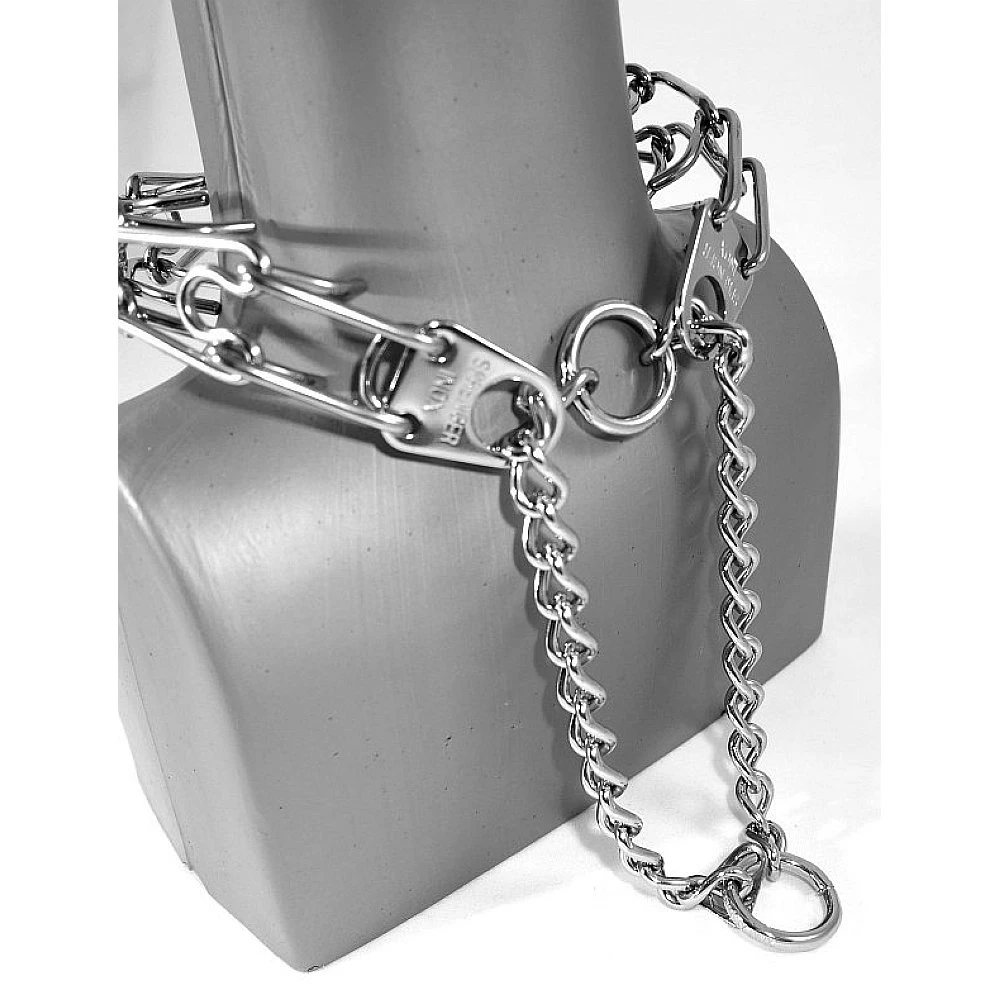 Die Glieder können beliebig entfernt oder hinzugefügt werden. So kann es auf den persönlichen Halsumfang angepasst werden werden. Hinten ist eine durch zwei Ringe fixierte Kette, die das Halsband zusammenzieht, wenn daran gezogen wird. Durch die kleine glatte Platte drückt das Halsband nicht direkt auf einen Wirbel, wenn die Verschlusskette nach vorne getragen wird. Schlanke Personen wissen das zu schätzen.